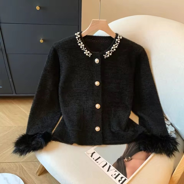 パールビジューの首元に、お袖口のファーがアクセントのニットカーディガン。 スタイリングをエレガントに仕上げてくれるニットカーディガンです。
