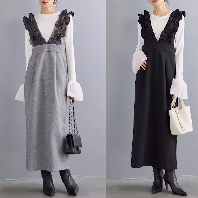 ショルダーフリルがエレガントなジャンパースカート。 インナーにはニットからTシャツまでシーズンレスにスタイリング出来、デイリーからお出かけまで様々なシーンに活躍させて頂けます。 サイズ 着丈 130