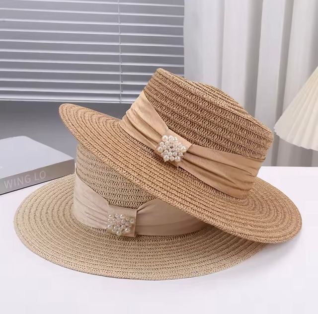 サイドリボンにパールが華やかなストローハット。 しっかりと日を避けて、スタイリングを華やかに仕上げます。