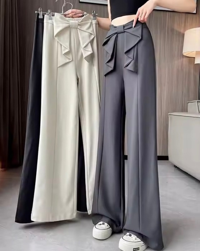 フロントにリボンがデザインされたパンツ。 カジュアルなスニーカー合わせや、ブラウスでエレガントにもスタイリングをお楽しみ頂けるボトムスです。 サイズ S ウエスト 62 ヒップ 92 着丈 99 M ウエスト 66 ヒップ 96 着丈 99 L ウエスト 70 ヒップ 100 着丈 100
