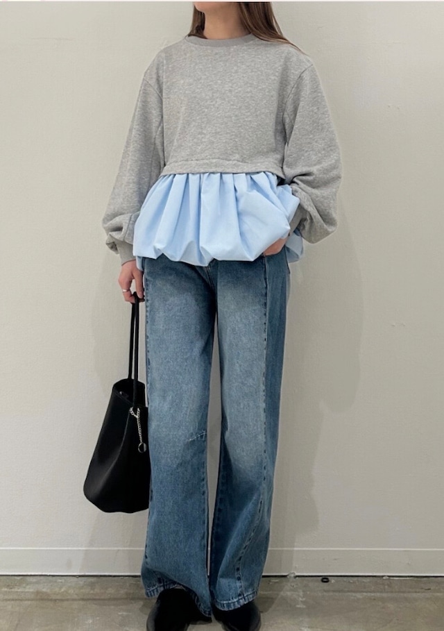 裏毛ドッキングのバルーンプルオーバーが登場 裏毛にハリのあるブロード素材をドッキングした、1枚で着映えするプルオーバー。 ウエスト下から切り替えたバルーンシルエットが、立体感と女性らしさをプラスします。 カジュアルな裏毛ときれいめ素材のコントラストで、デイリーにもきちんと感のあるスタイリングに。 パンツ合わせでもバランスよく決まる、主役トップスです。 サイズ 着丈42/64cm 身巾50cm 肩巾50cm 袖丈61cm 裾巾45/68cm ■素材・成分: 【本体】ポリエステル 54% 綿 46% 【リブ部分】ポリエステル 77% 綿 20% ポリウレタン 3% 【表地】ポリエステル 81% 綿 20% 【裏地】ポリエステル 89% 綿 11%