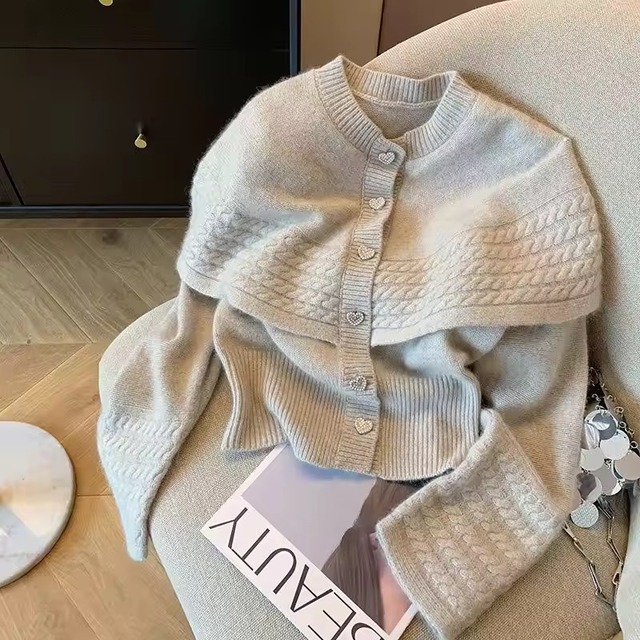 ケープをレイヤードしたようなデザインに、ハートボタンが可愛いニット。 ケープやお袖のニット柄もアクセントに。 素材 ポリエステル スパンデックス