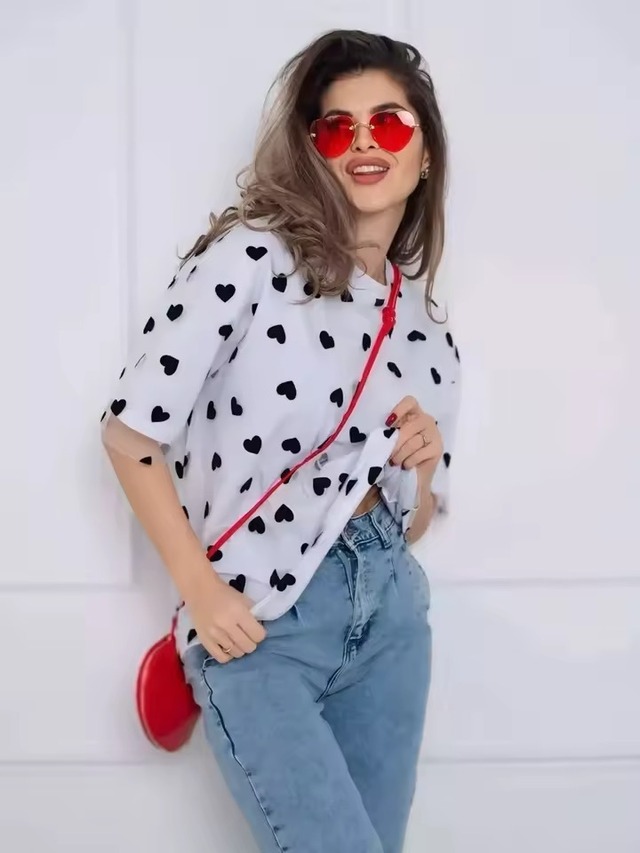 ドットハートチュールがレイヤードデザインになったTシャツ。 カジュアルにも、ブラウス感覚でもスタイリングをお楽しみ頂けるTシャツです。 サイズ バスト 104 着丈 70-77