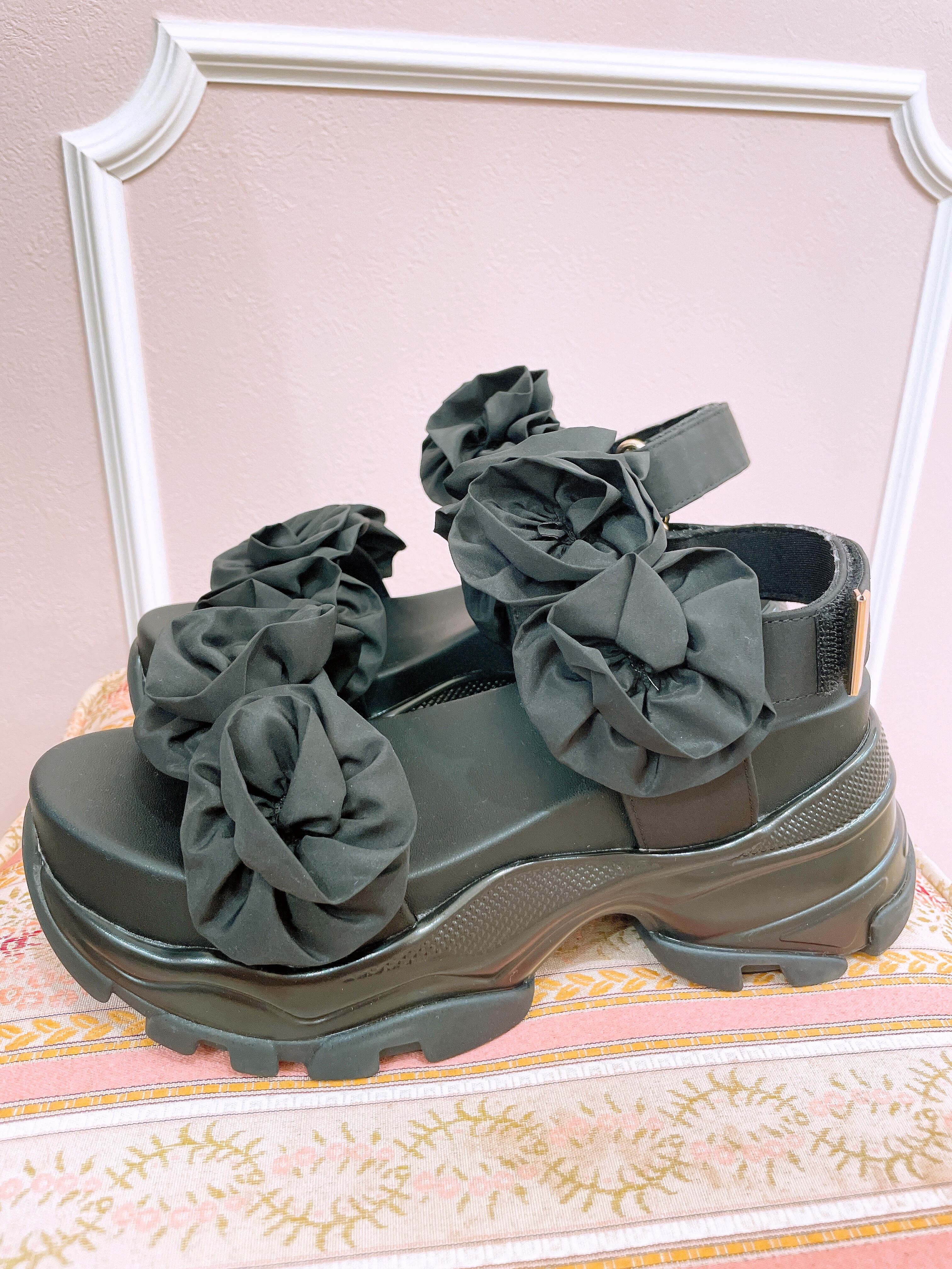フラワーデザインが華やかな厚底サンダル。