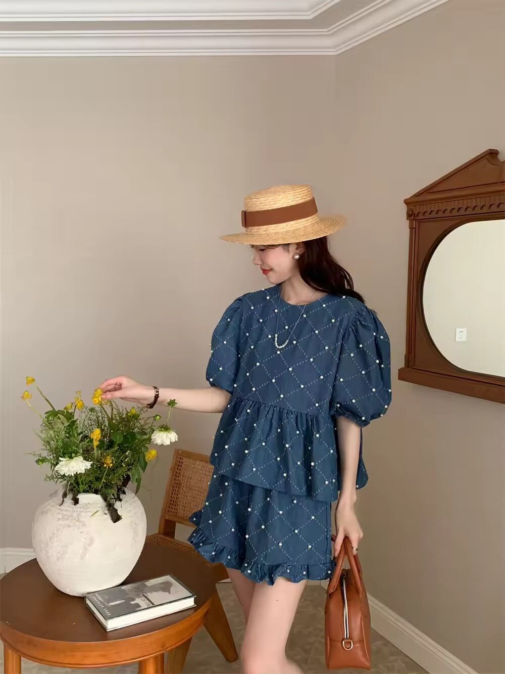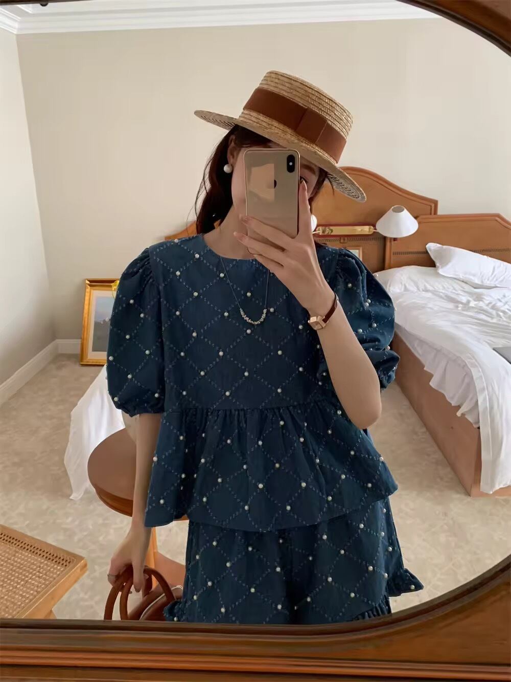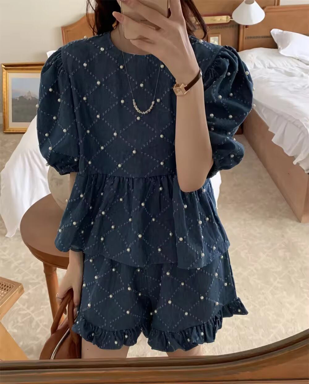 セパレートにもお楽しみ頂けるセットアップは、ランタンスリーブのトップスに、裾フリルのショートパンツで単品使いもスタイリングのアクセントに。