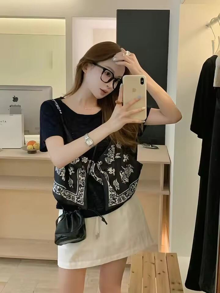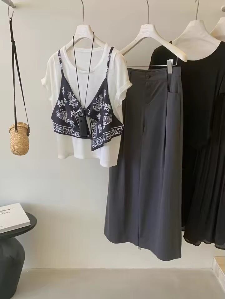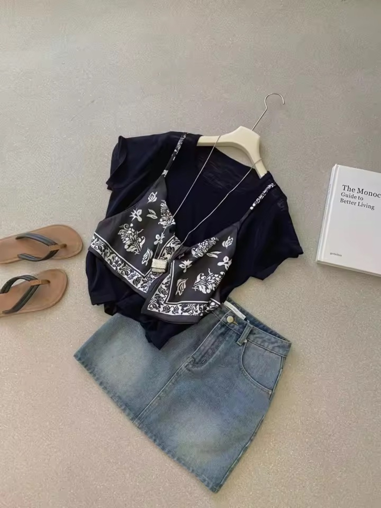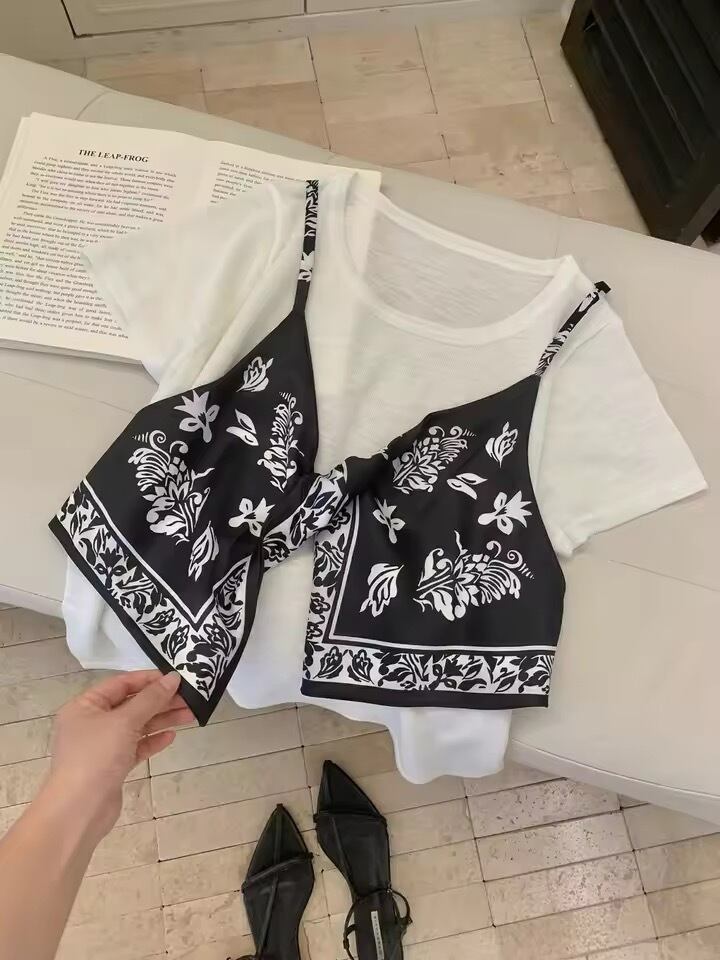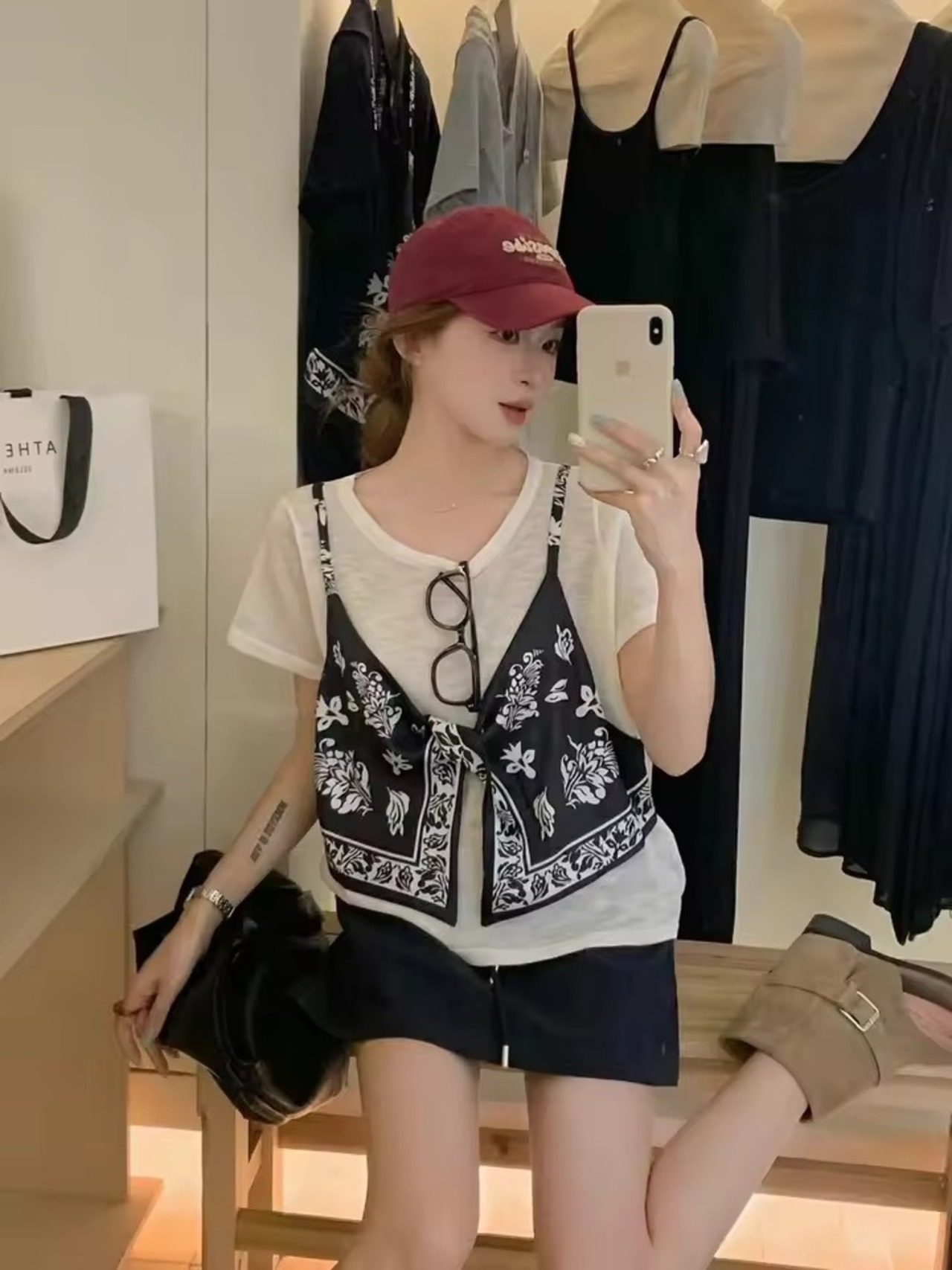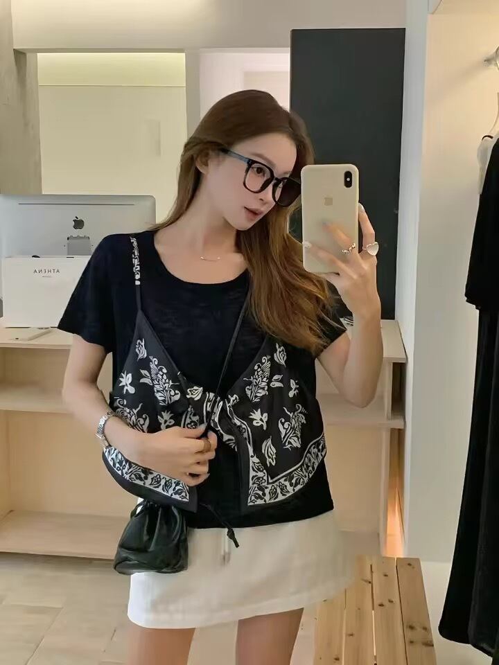 スカーフドッキングデザインのTシャツはキャミソールを重ね着したような遊び心あるデザインに。