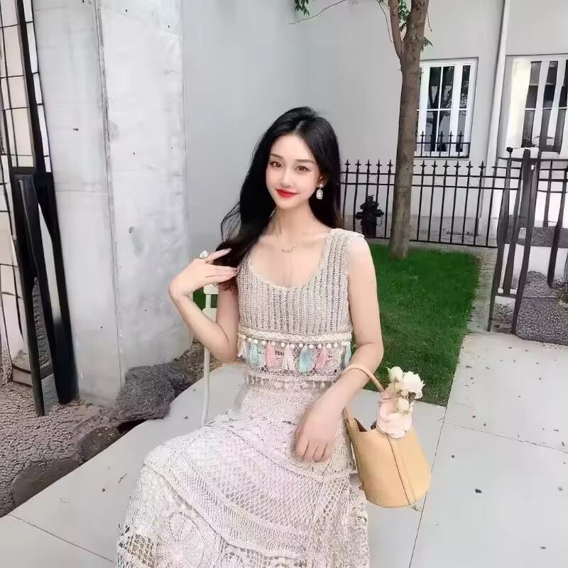 繊細なクロシェットレースとマルチカラーのフリンジが魅力のセットアップです。
