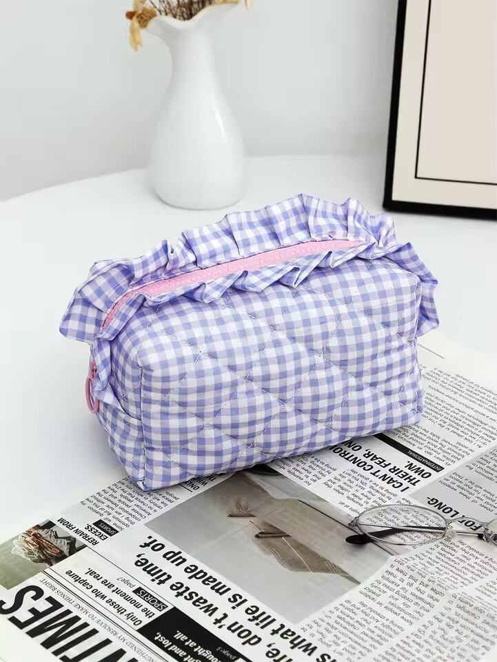 お好みカラーとフォントで、ネーム刺繍をカスタマイズ頂けるギンガムチェックフリルポーチ。