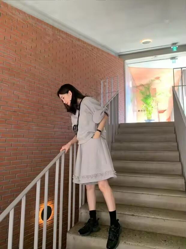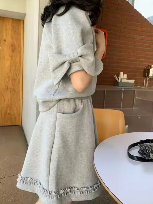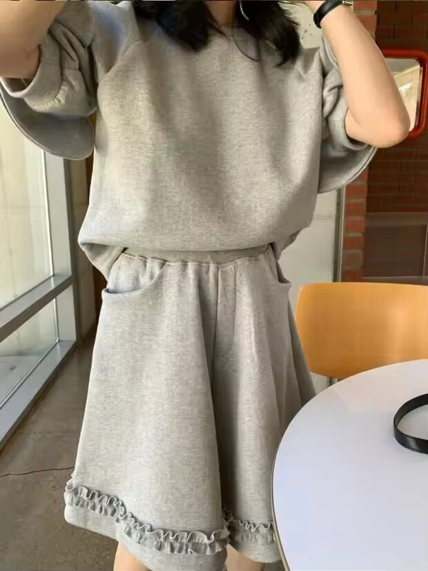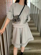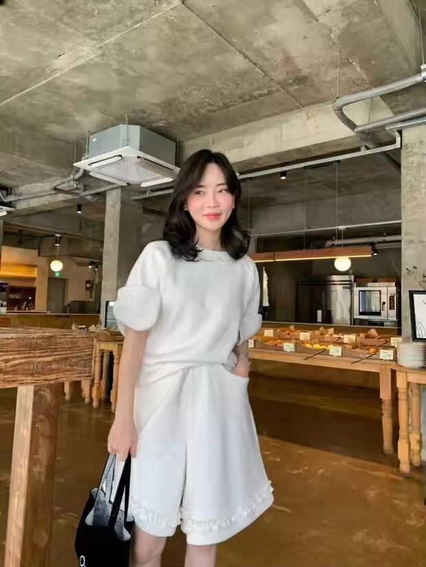 リボンスリーブのトップスに、フリルデザインのショートパンツのセットアップ。