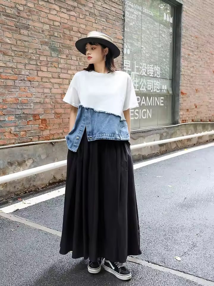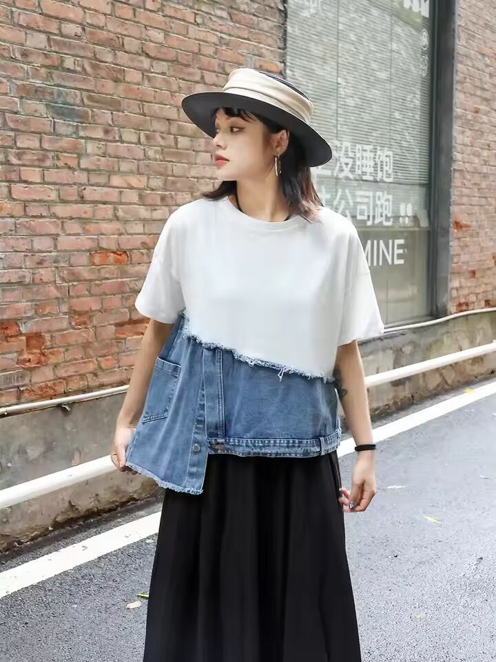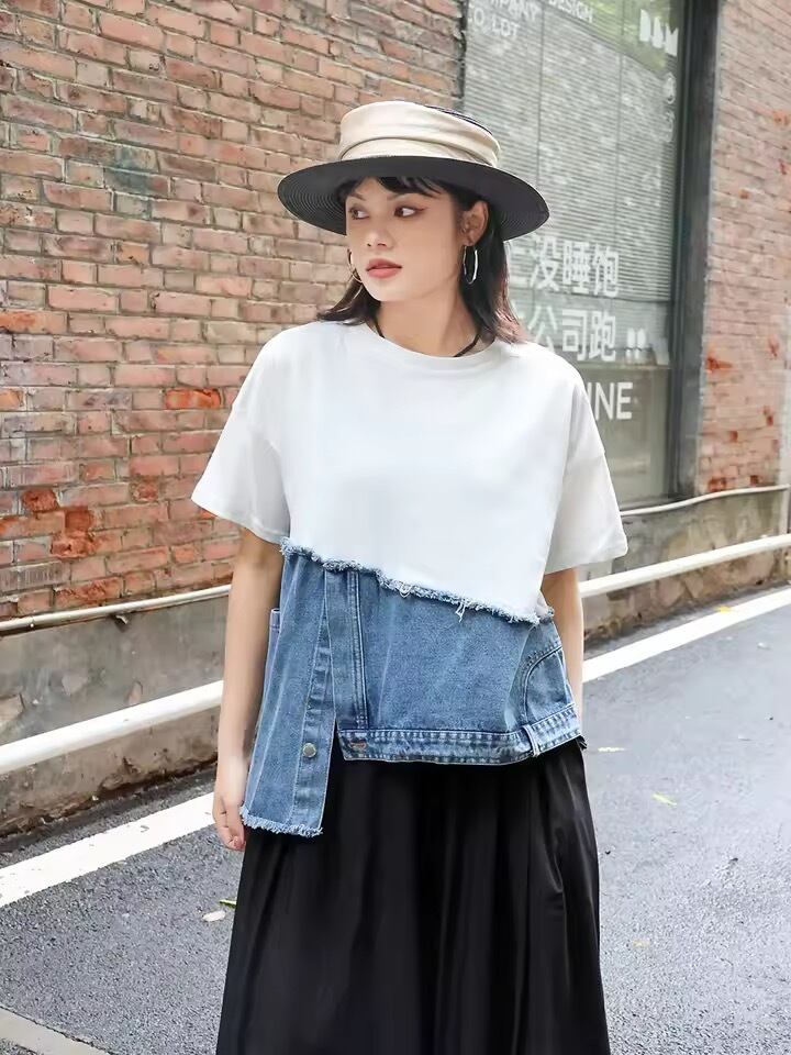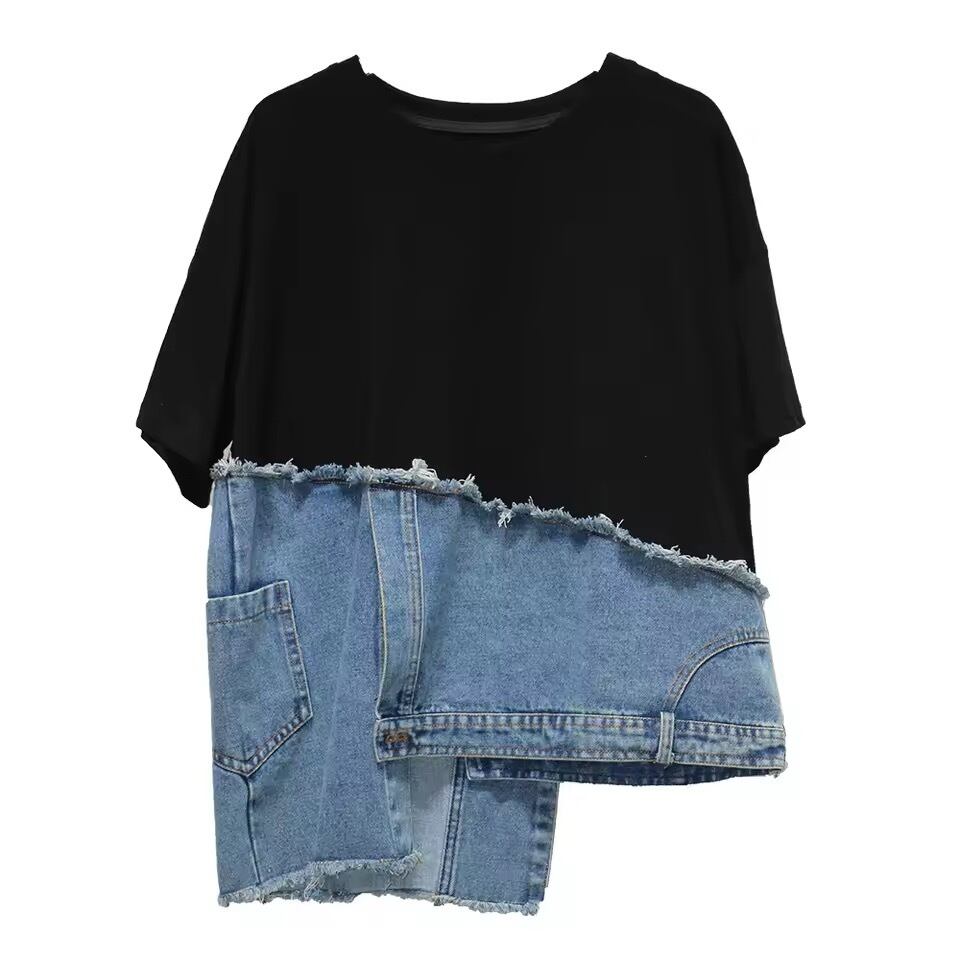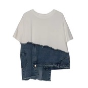 アシンメトリーな着丈にデニムドッキングデザインがオシャレなTシャツ。