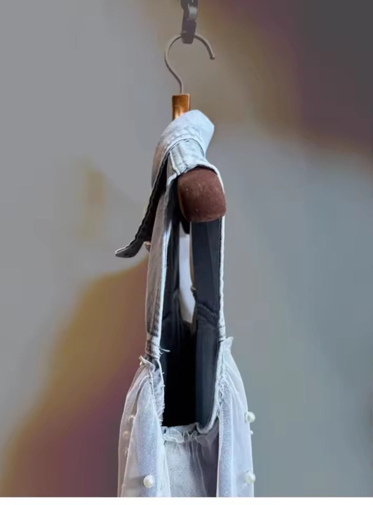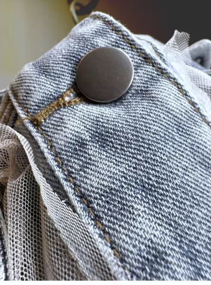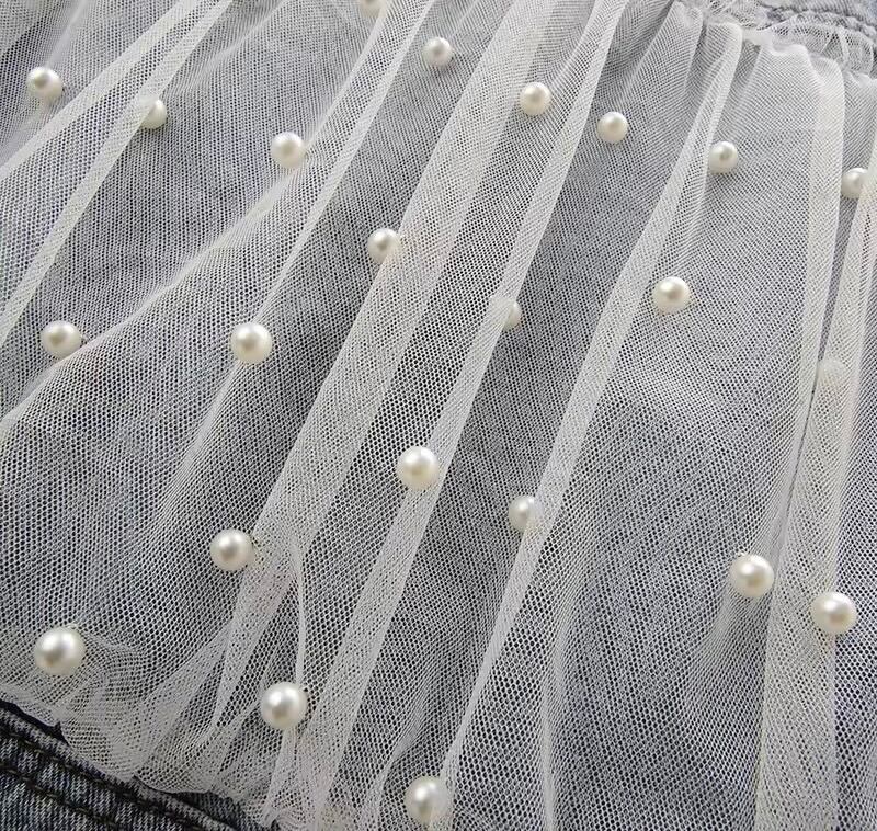 パールとチュールがドッキングデザインになったデニムジレ。