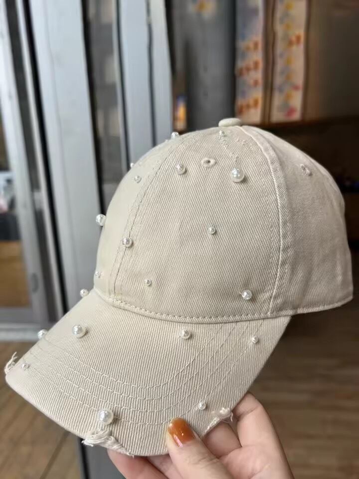 ダメージデザインとパールのギャップがオシャレなキャップは、フェミニンなスタイリング合わせにも、抜け感をプラスします。