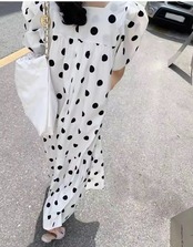 パフショルダースリーブがアクセントのドット柄ワンピース。