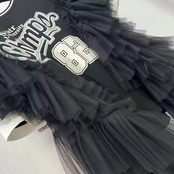 カジュアルなプリントとエレガントなチュールフリルのミックスがオシャレなトップスです。