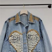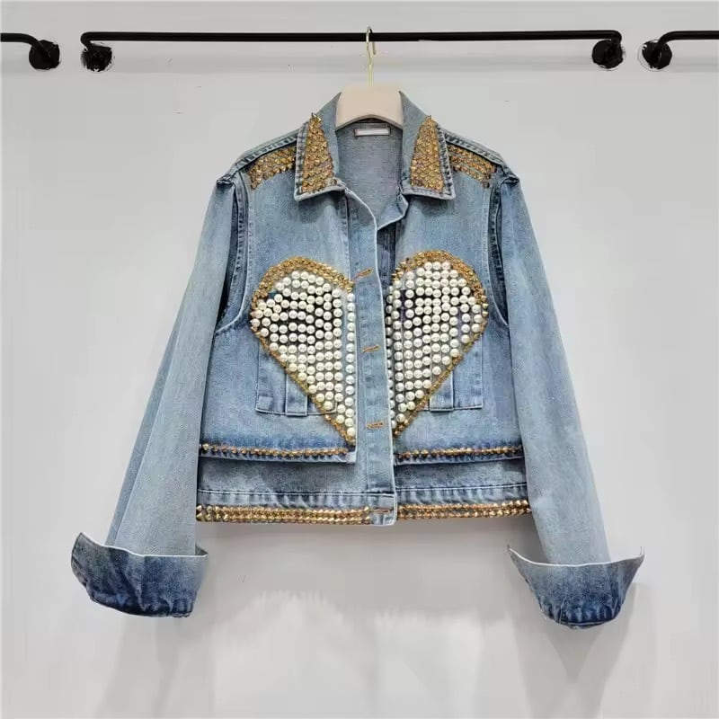ハートデザインのパールとスタッズの甘辛なデザインが魅力のデニムジャケット。