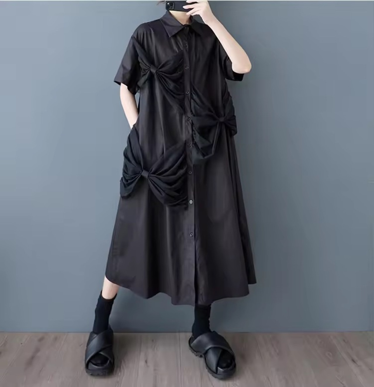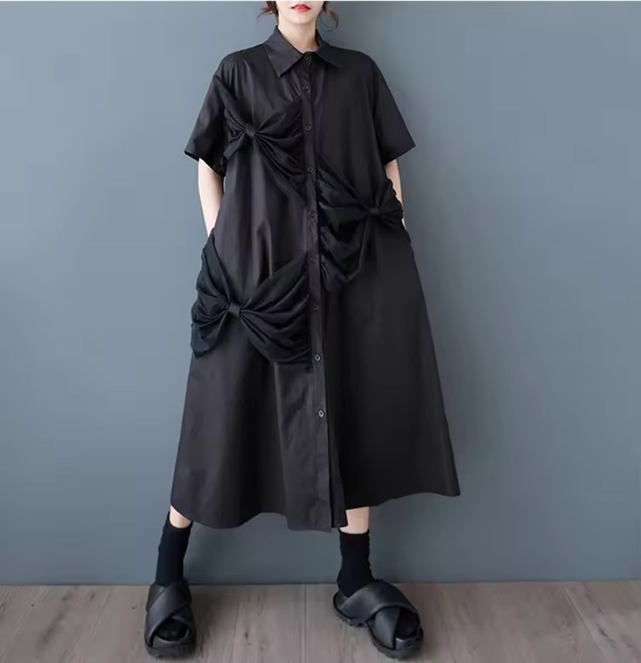 シンプルなシャツワンピースとリボンのバランスが甘辛でオシャレなスタイリングに。