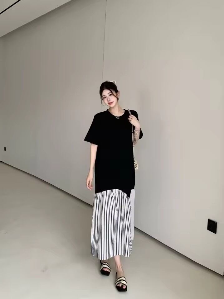 ストライプや配色デザインのドッキングワンピース。