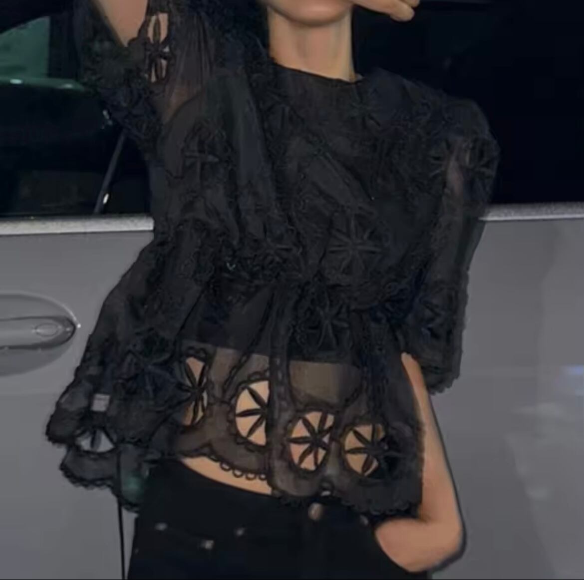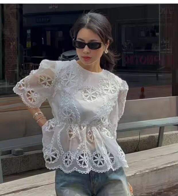 シンプルなデニムスタイルなどにも、よりレースが映えるトップスです。