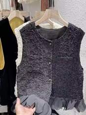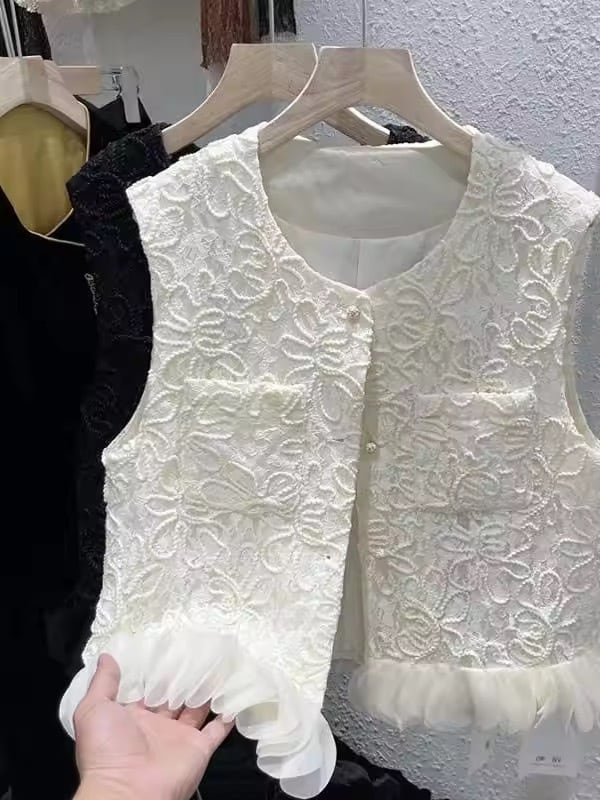 裾フリルにフラワーデザインが華やかなジレ。