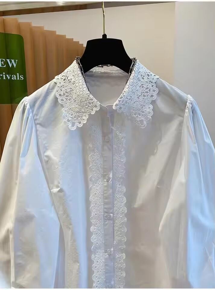 襟元、お袖、フロントにレースがデザインされたブラウス。
