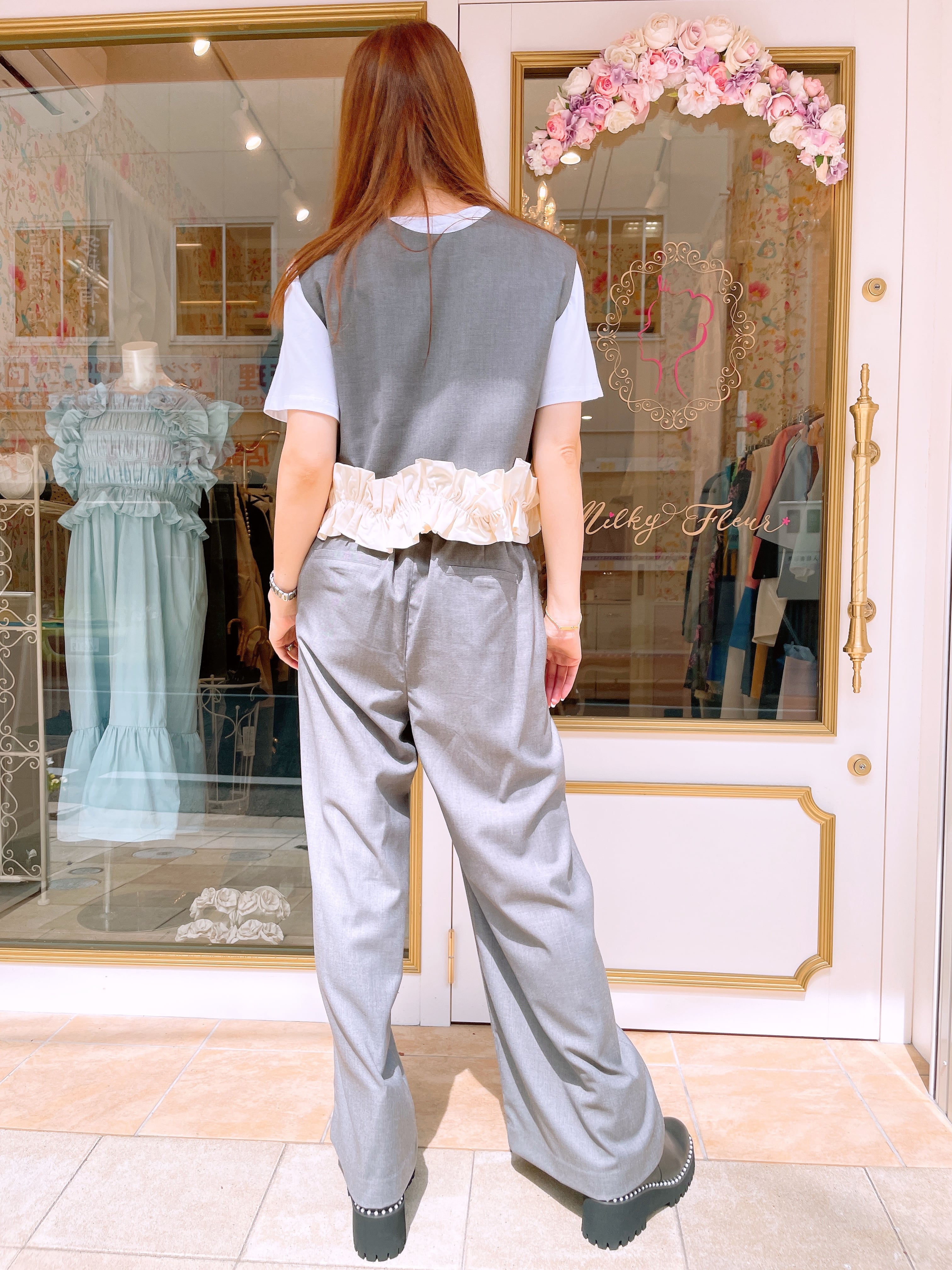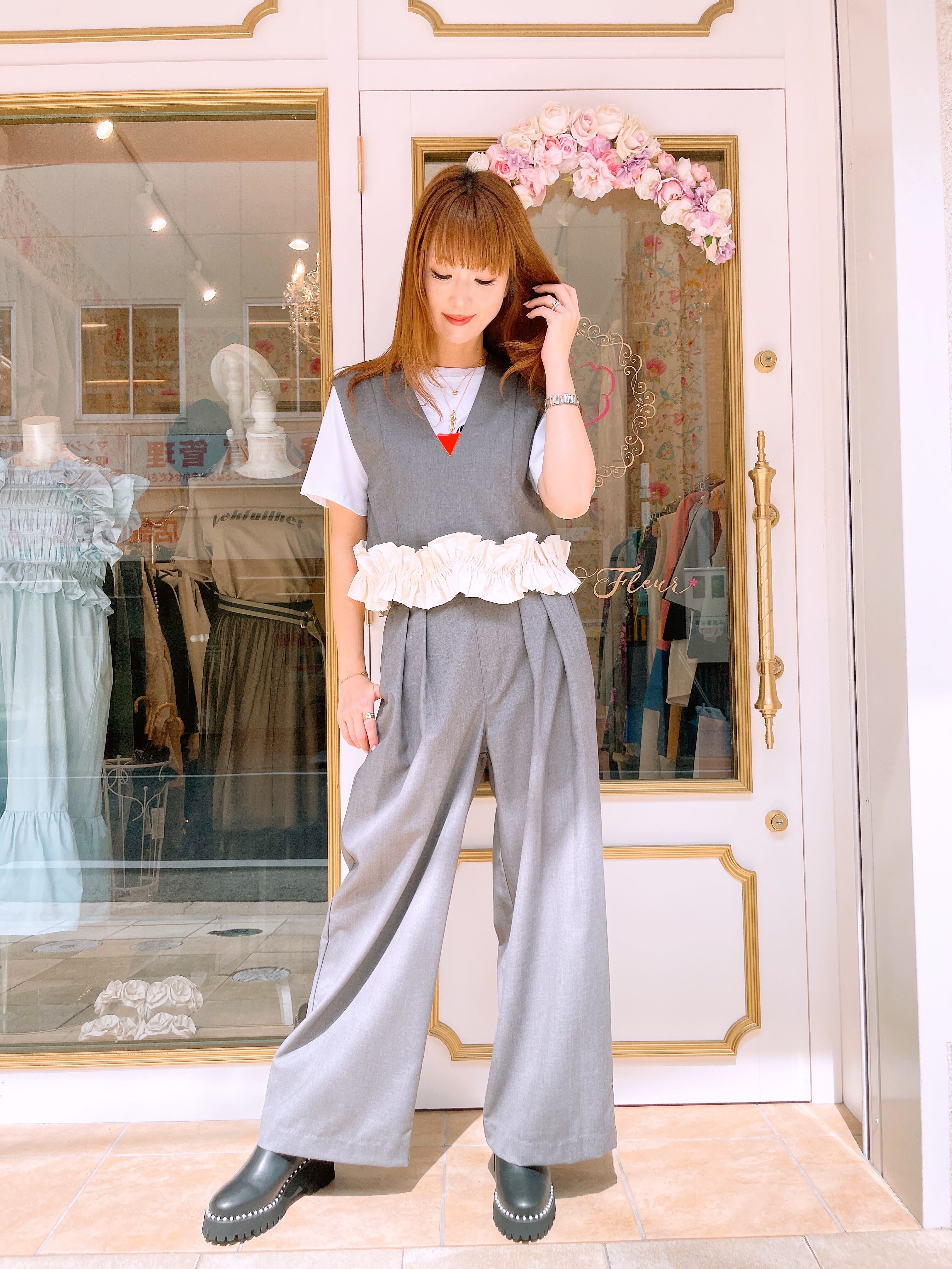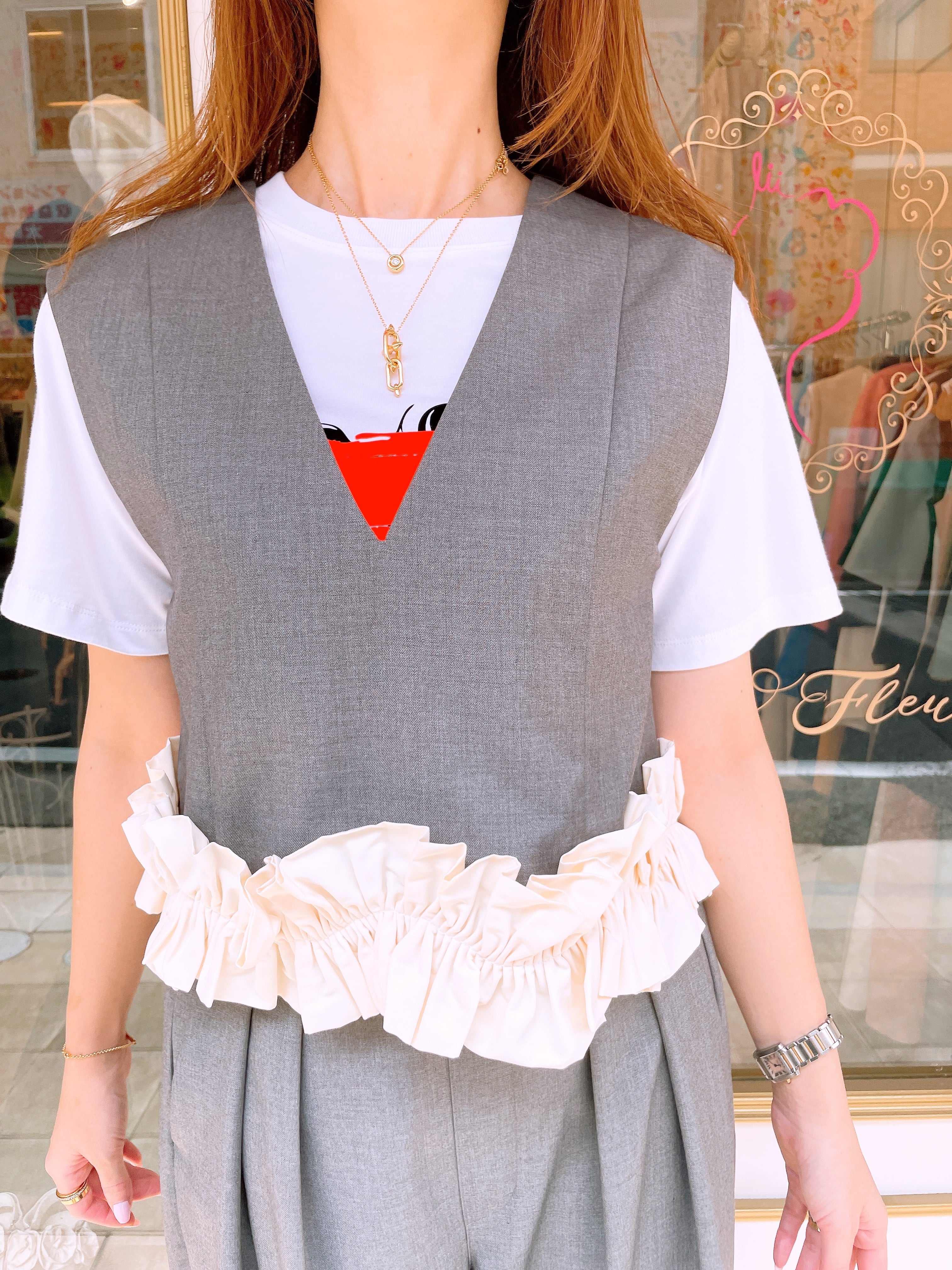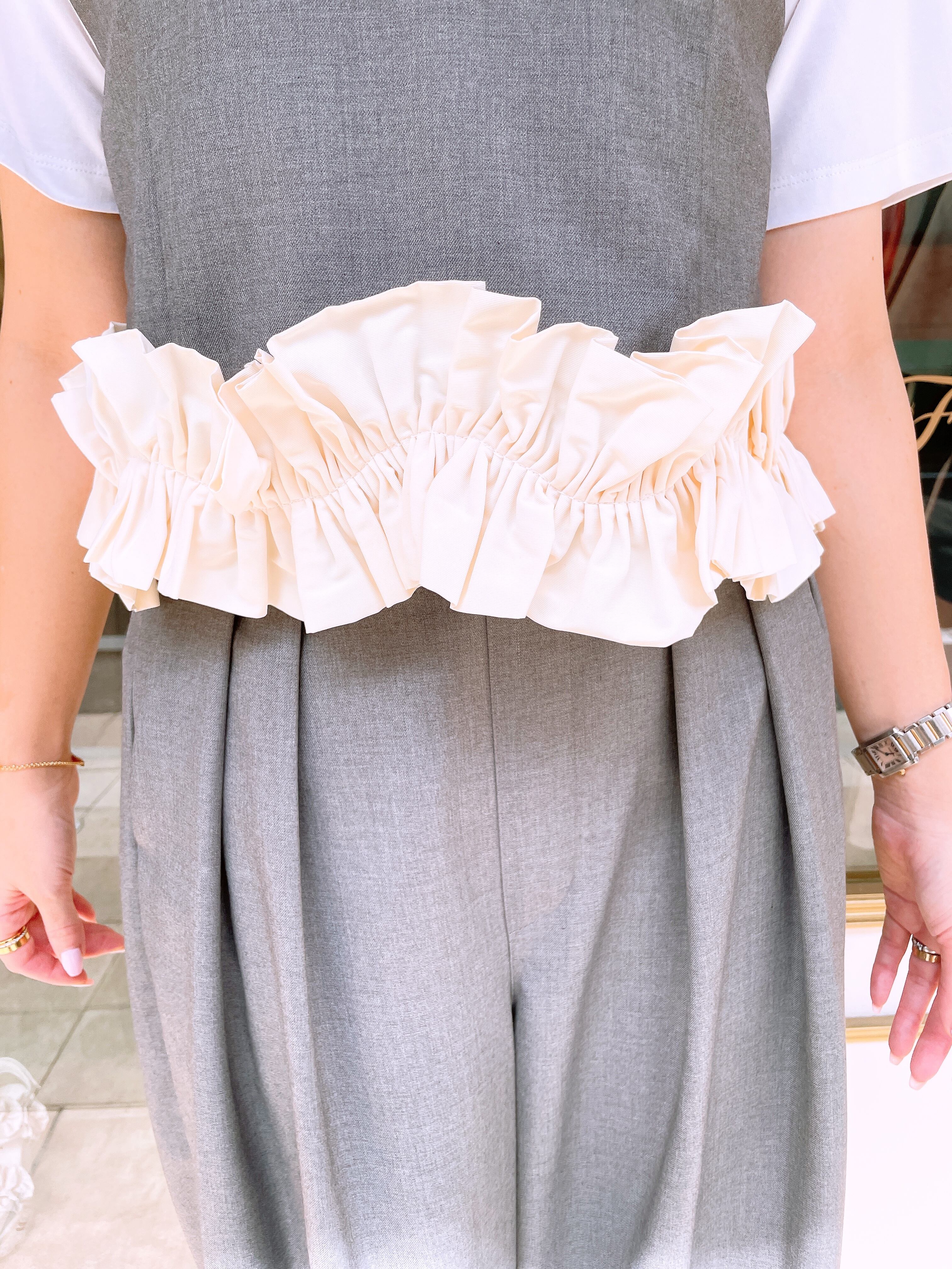 裾をぐるりと囲む立体的なフリルが遊び心と華やかさを添えつつ、気になるウエスト周りもさりげなくカバーしてくれます。