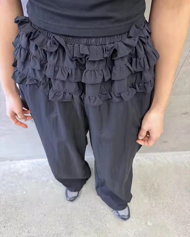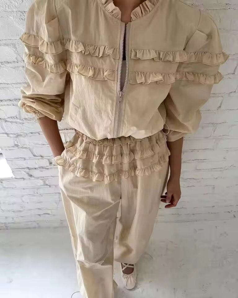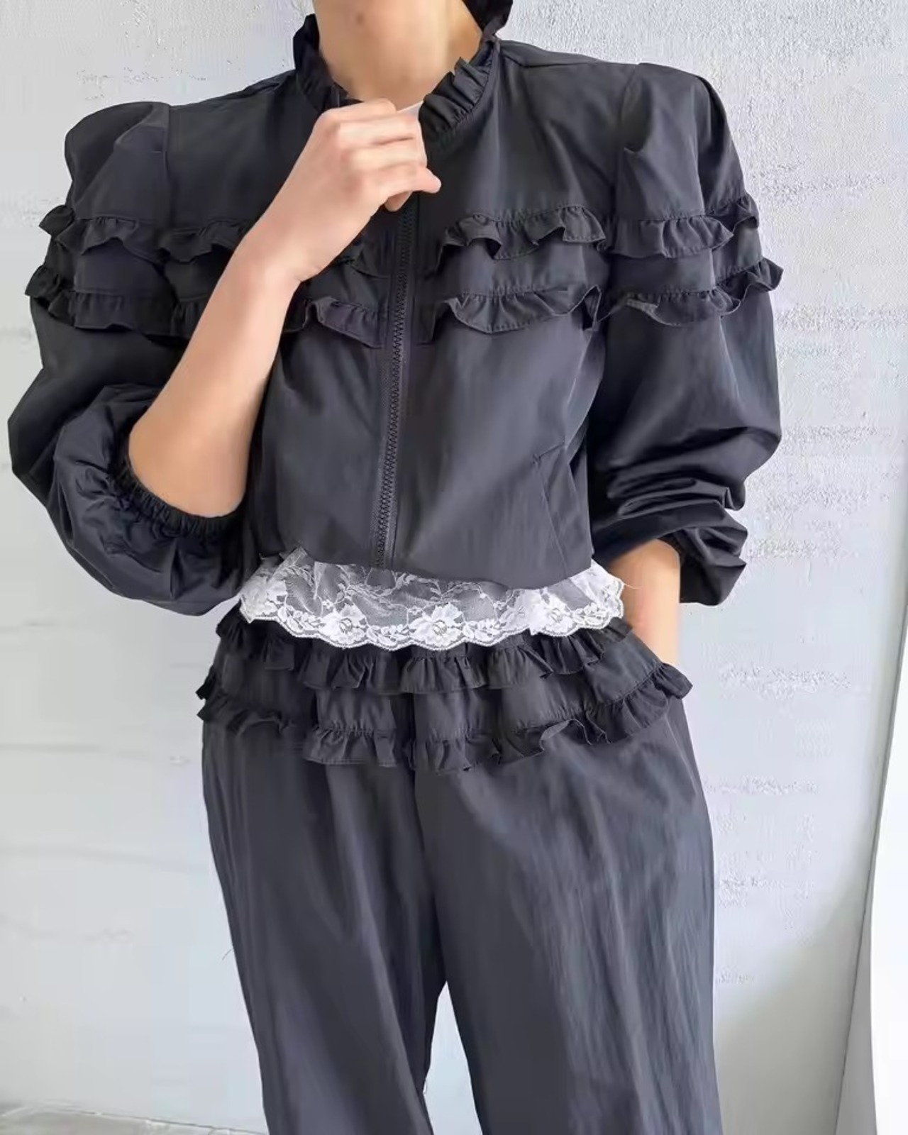 首元や、お袖、フロントにフリルがデザインされたブルゾンに、ウエストフリルのボトムスがセットアップに。