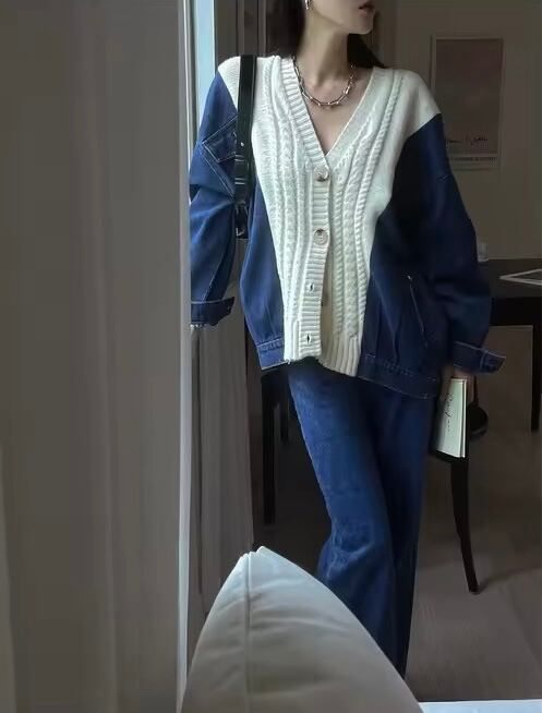 ニットとダンガリーがドッキングデザインになったカーディガン。