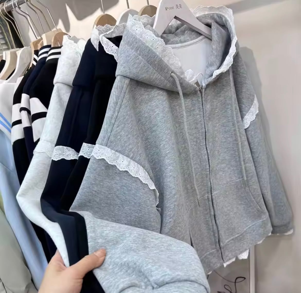 フードやお袖にレースがデザインされたジップアップパーカー。