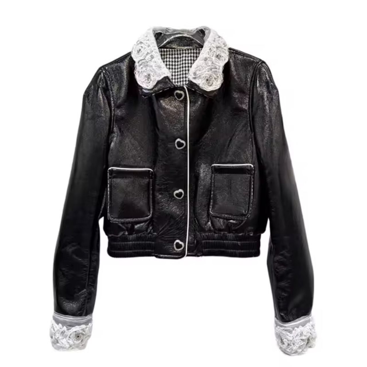レースカラーハートボタンレザージャケット(一ヶ月程でお届け)
