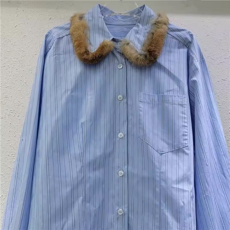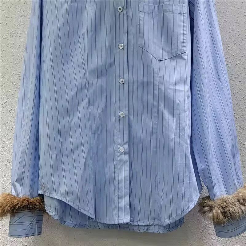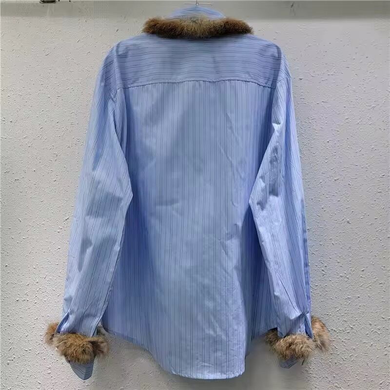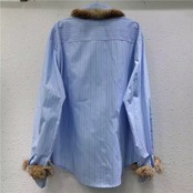 襟元とお袖口にファーがデザインされたストライプシャツ。