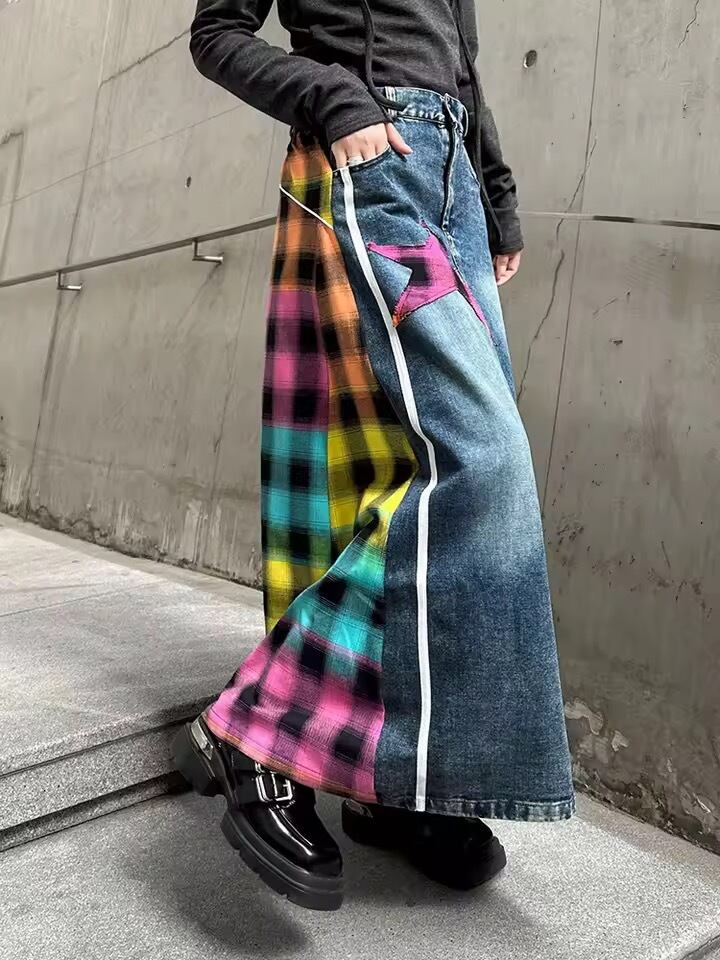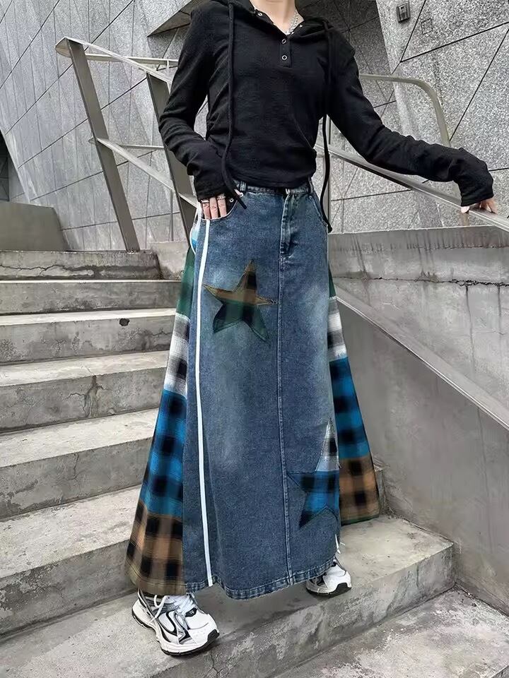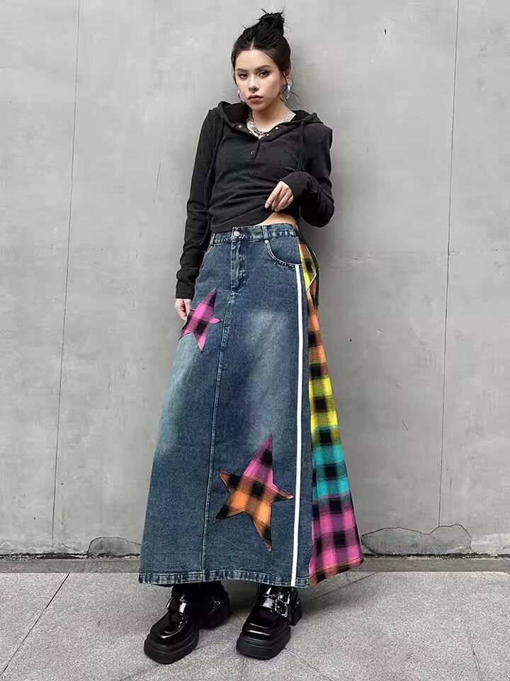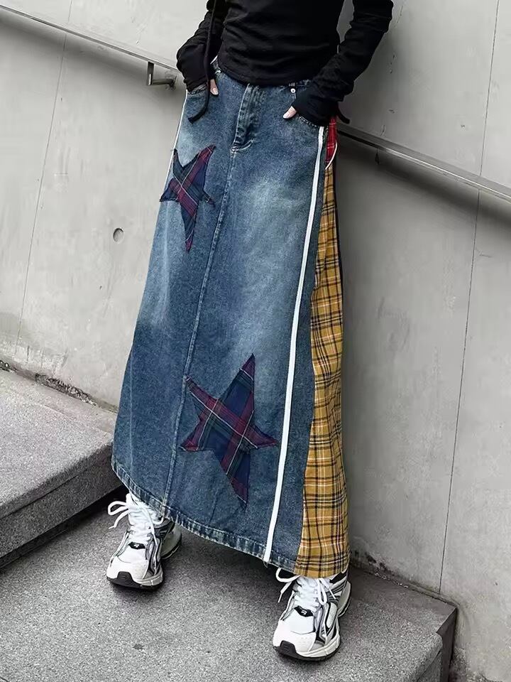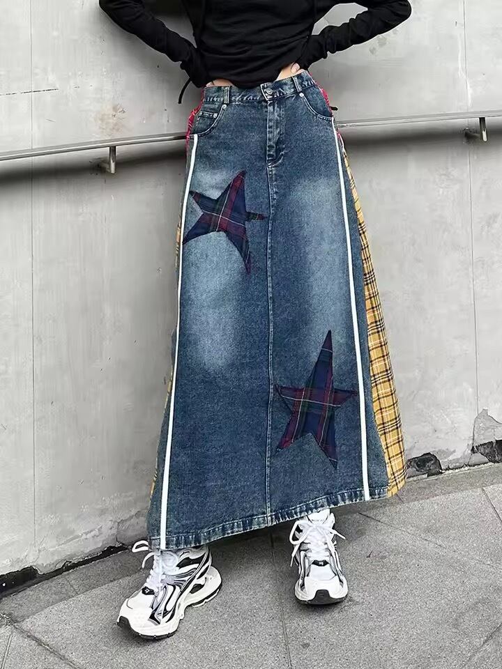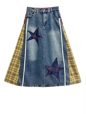 チェック柄のスターがデザインされたドッキングデニムスカート。