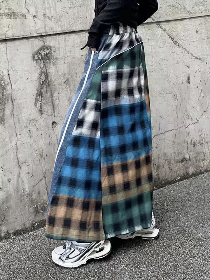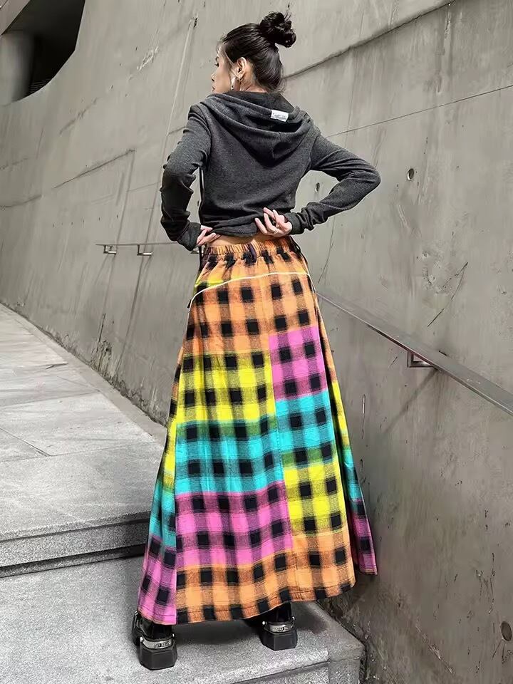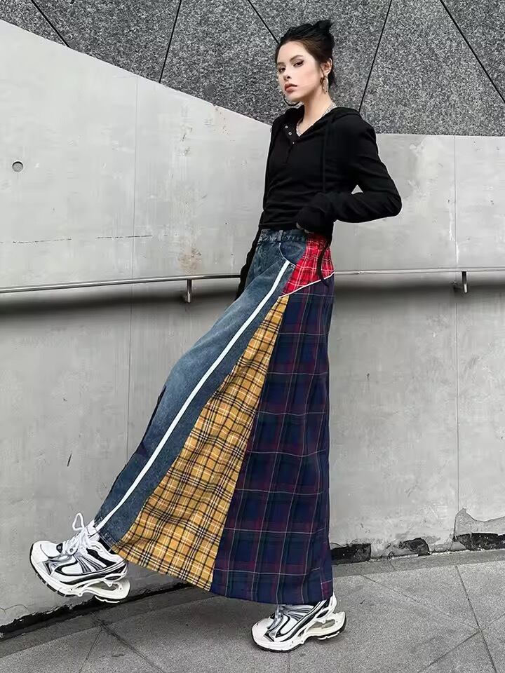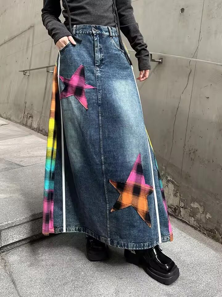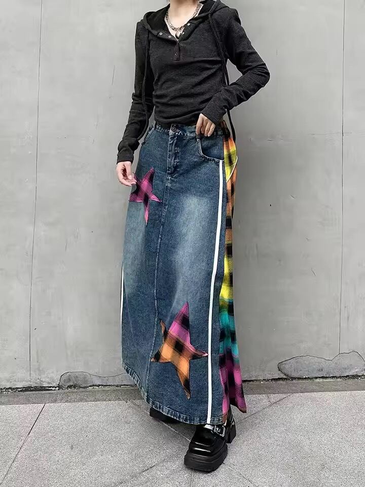 チェック柄のスターがデザインされたドッキングデニムスカート。