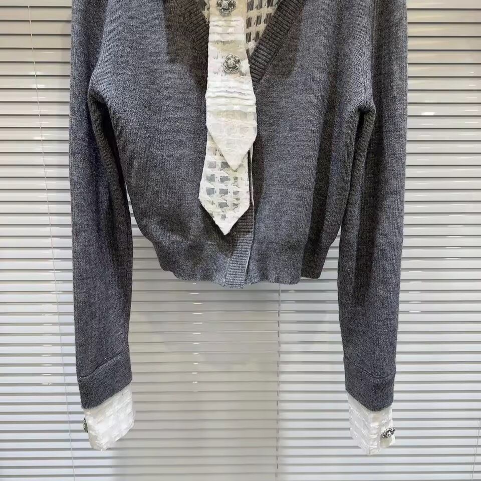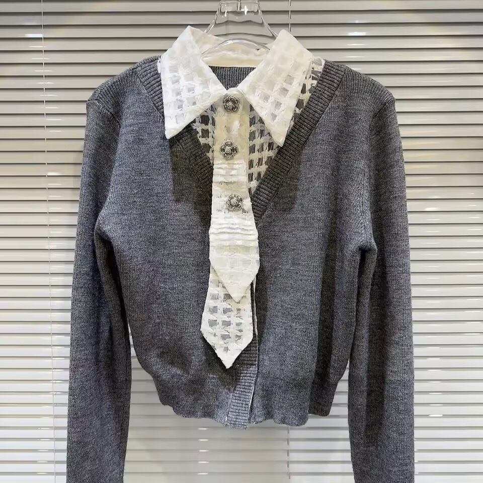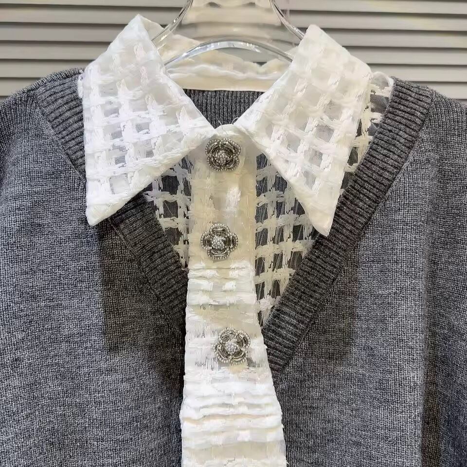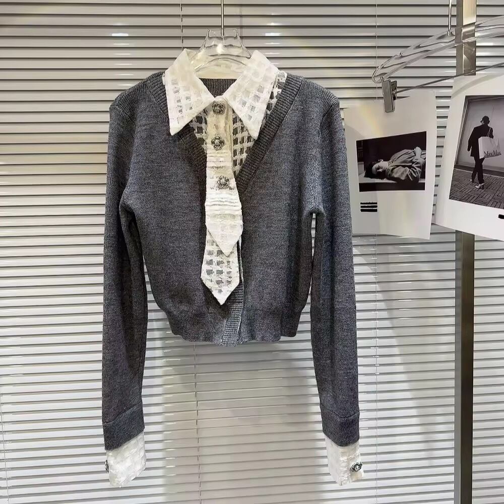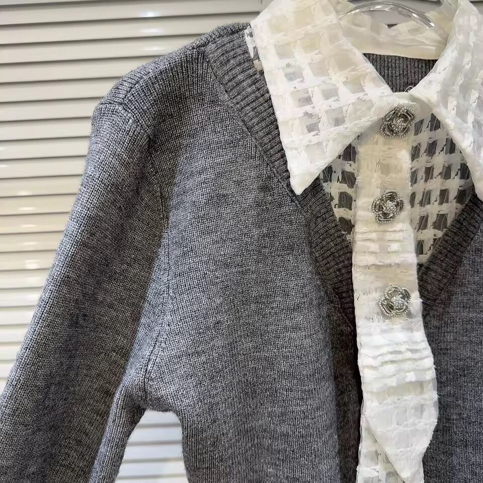 スクエアレースのブラウスを重ね着したようなデザインが大人可愛いニット。