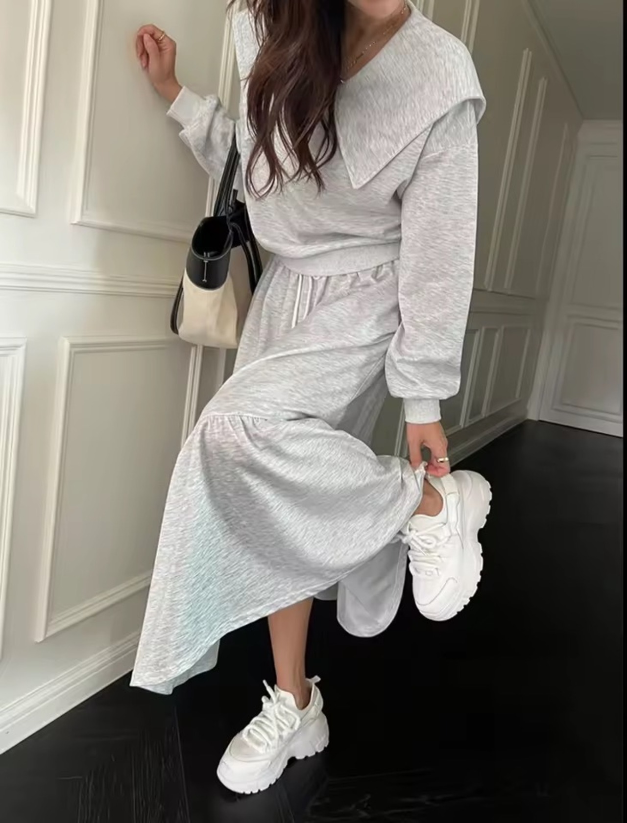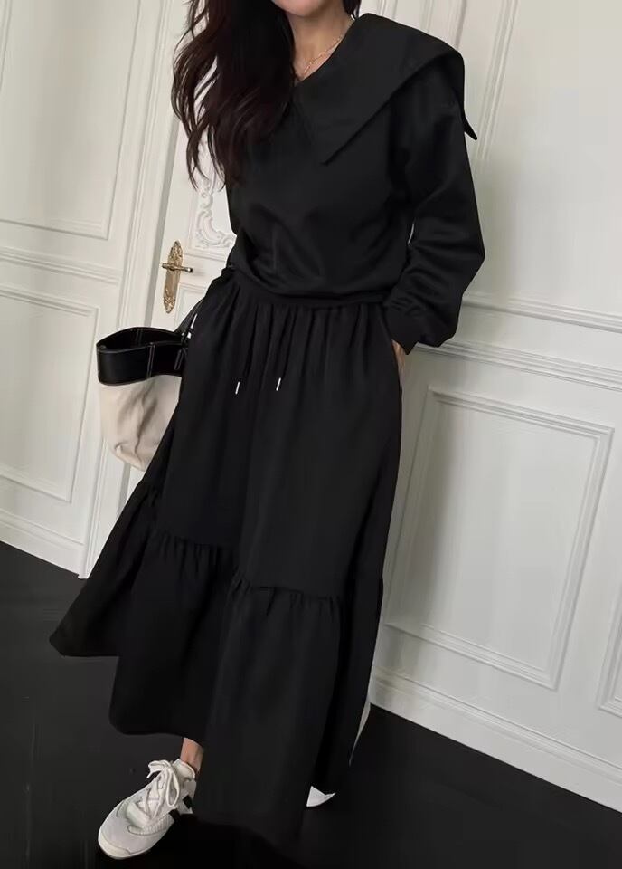 セーラーカラーがアクセントのスウェットトップスとスカートのセットアップ。