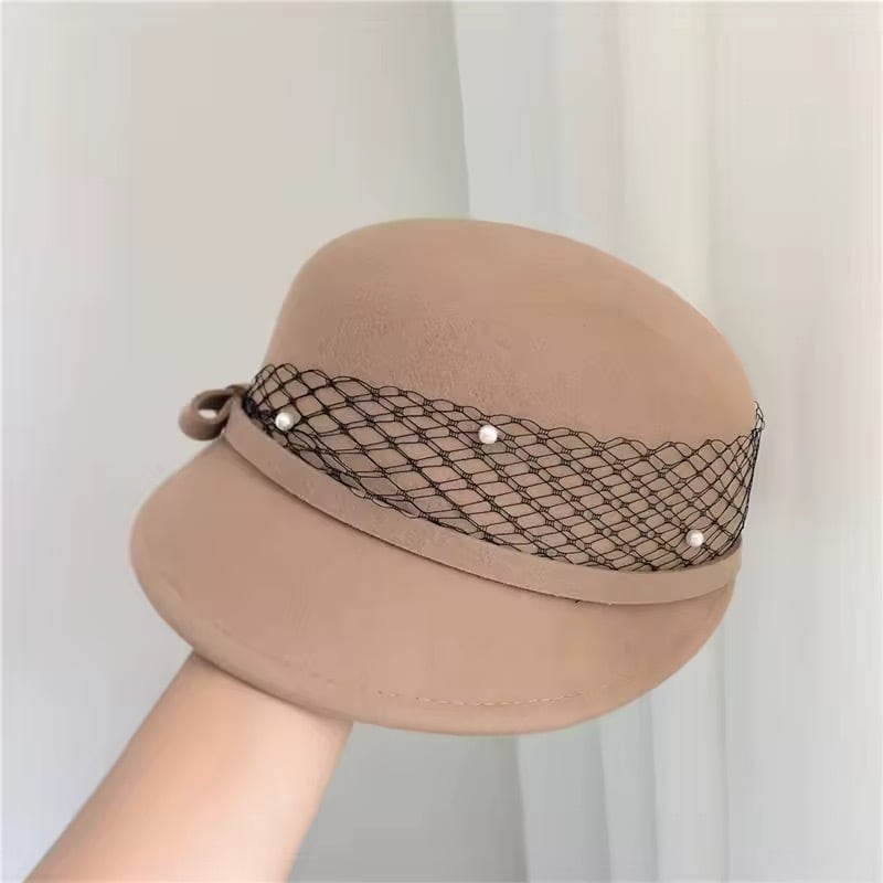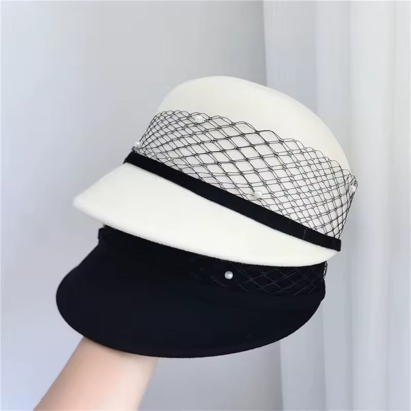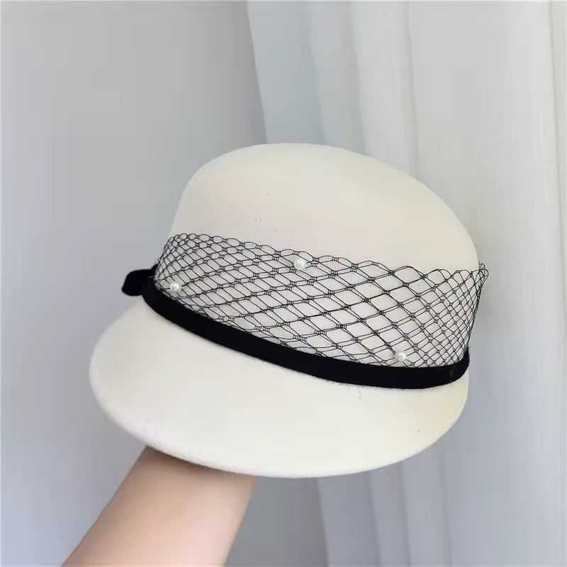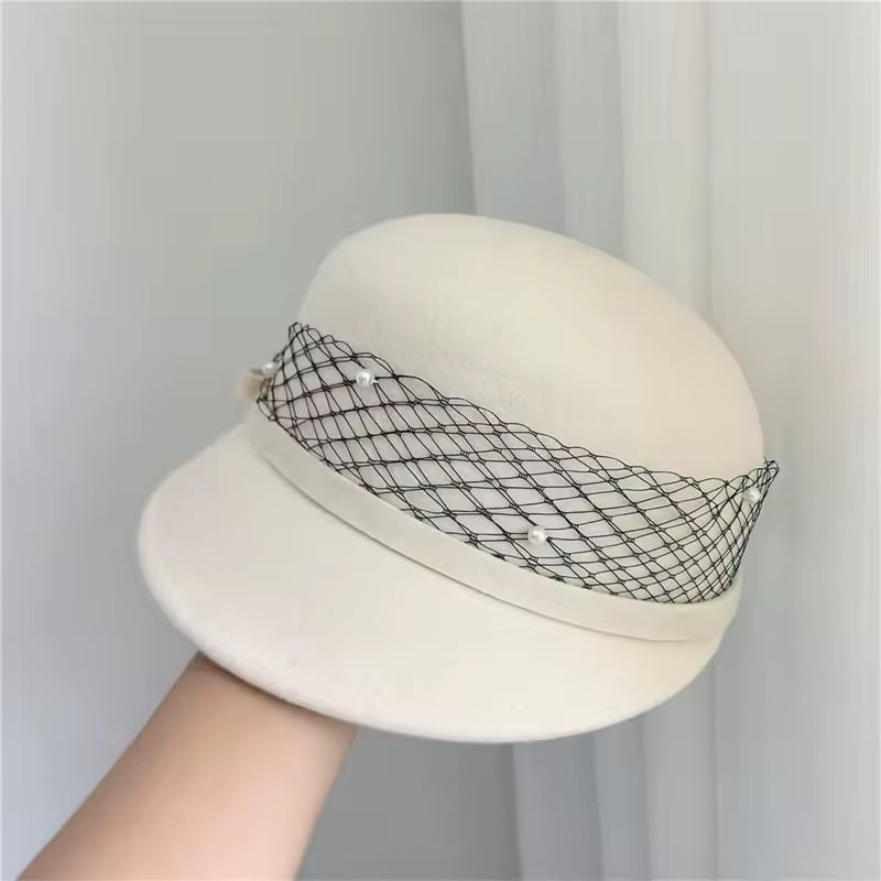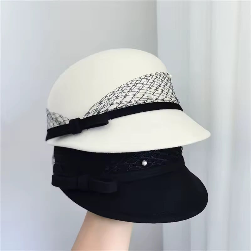 メッシュとパールにリボンがデザインされたウールキャスケット。