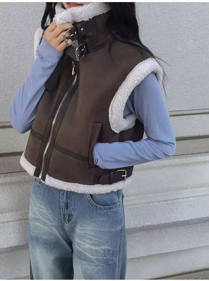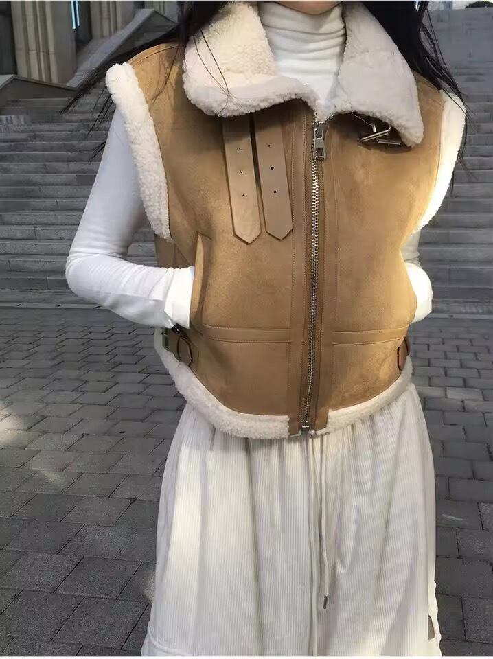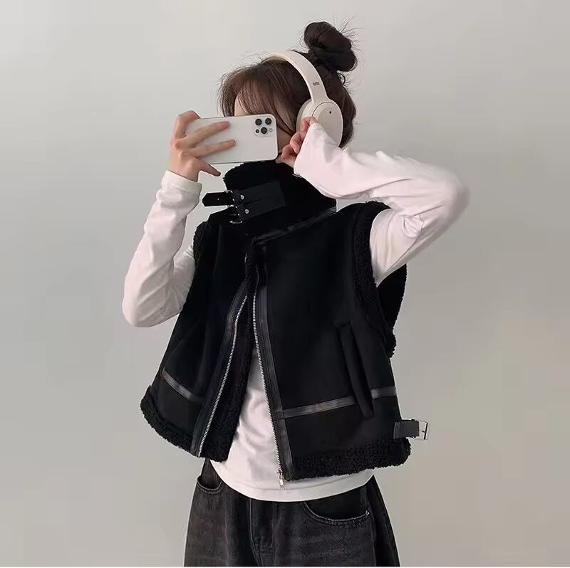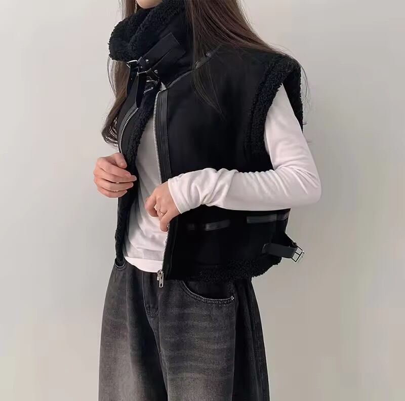 ボアが暖かく、シンプルニットとのスタイリングに映えるジレです。