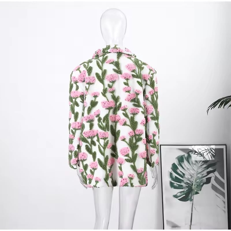 立体感あるフラワー柄が華やかなアウター。