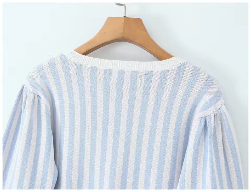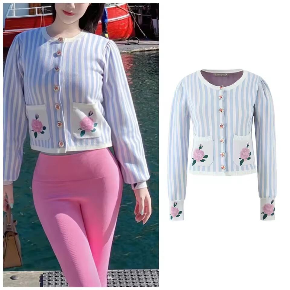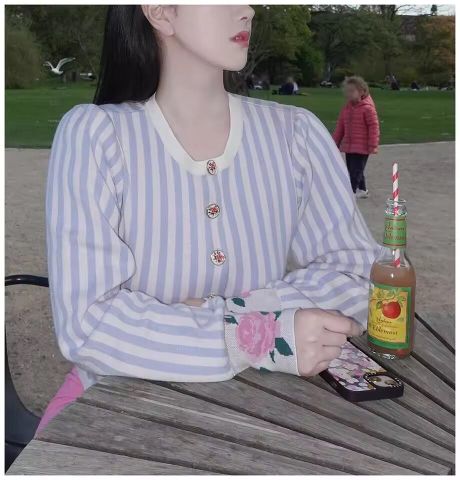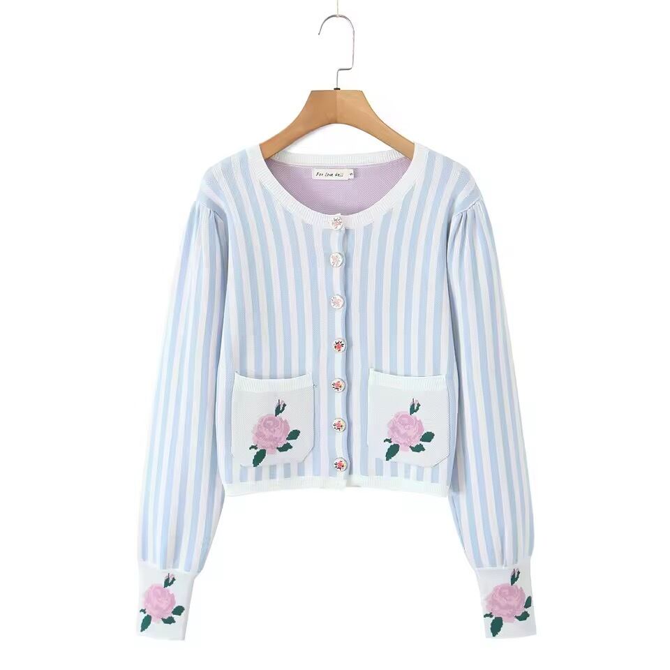 お袖やポケット、ボタンにバラがデザインされたストライプニットカーディガン。