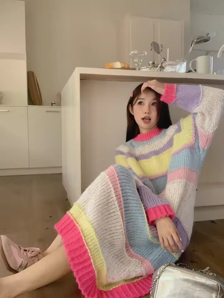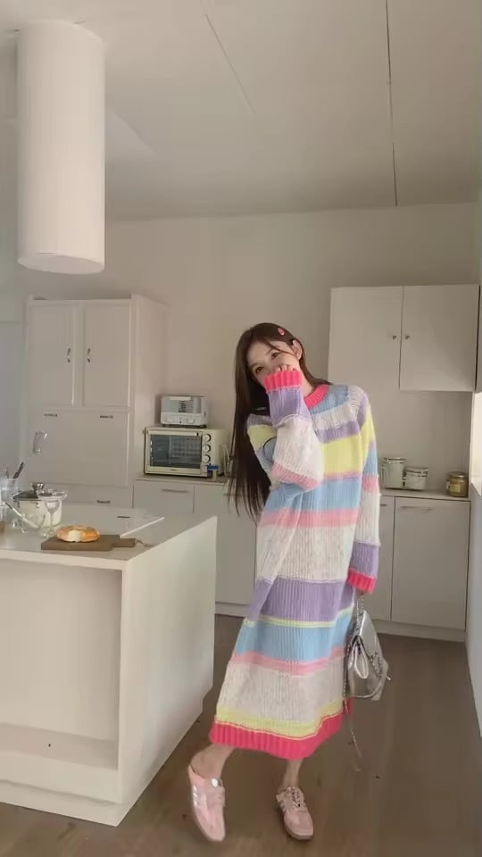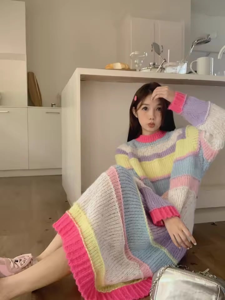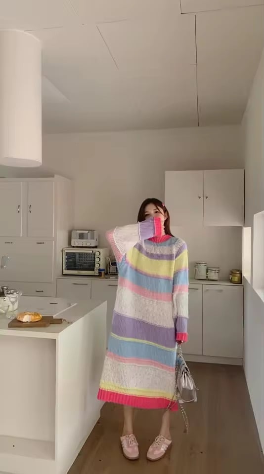 マルチカラーボーダーデザインのニットワンピース。