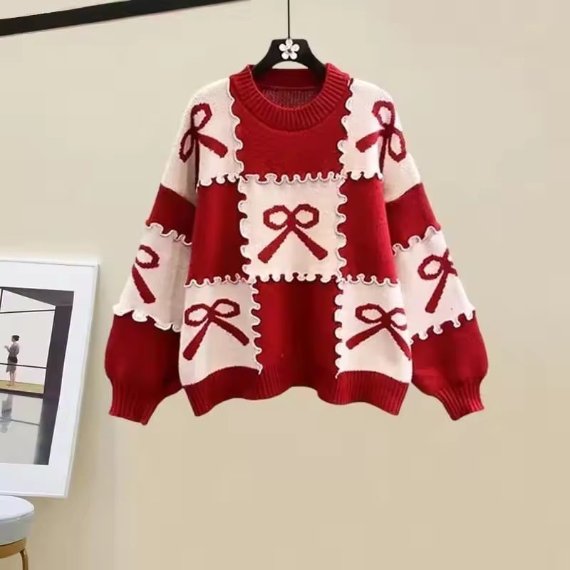 リボンと配色デザインにフリルが華やかなニット。