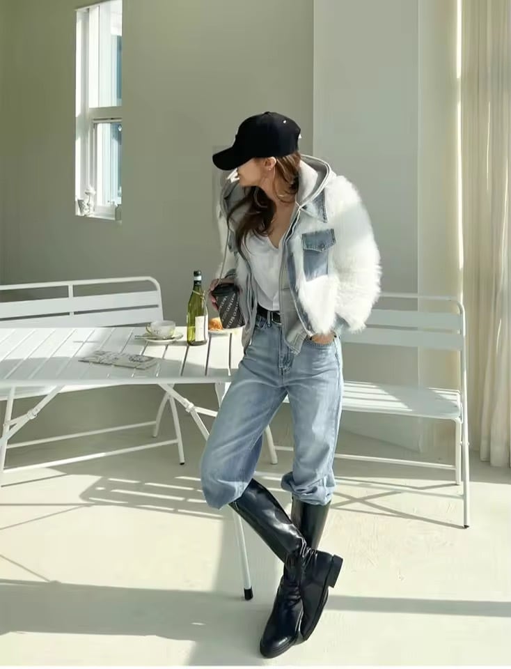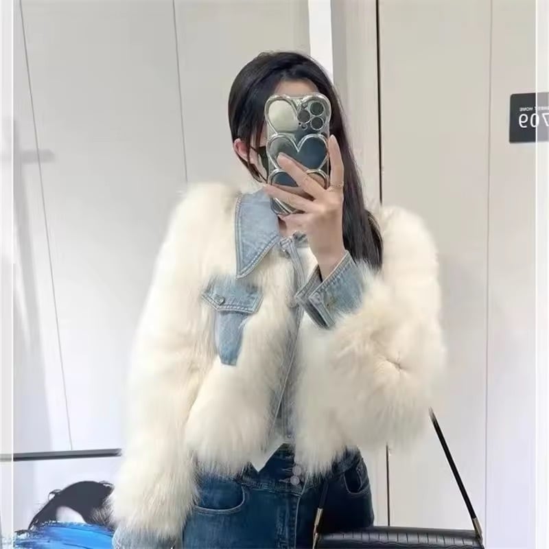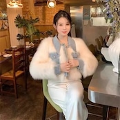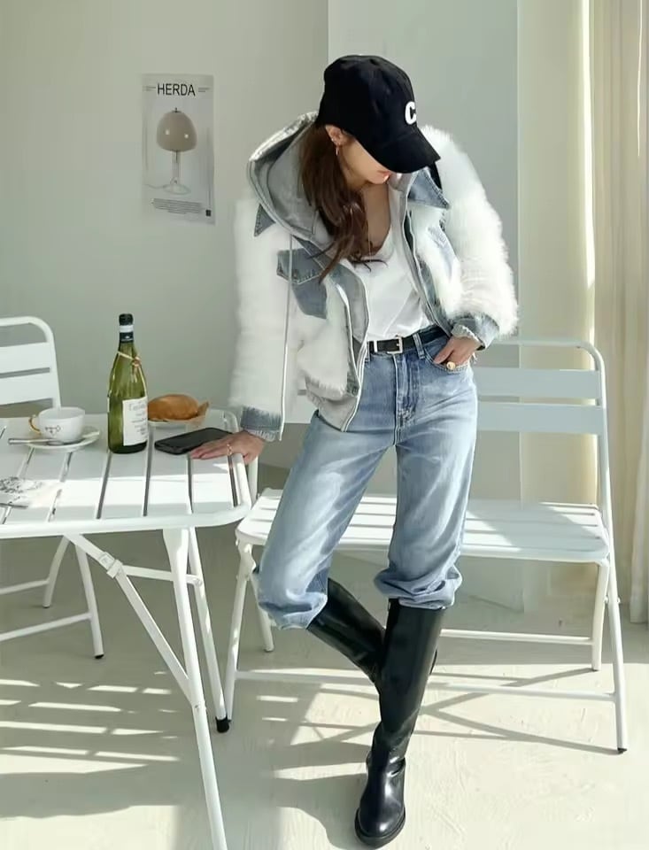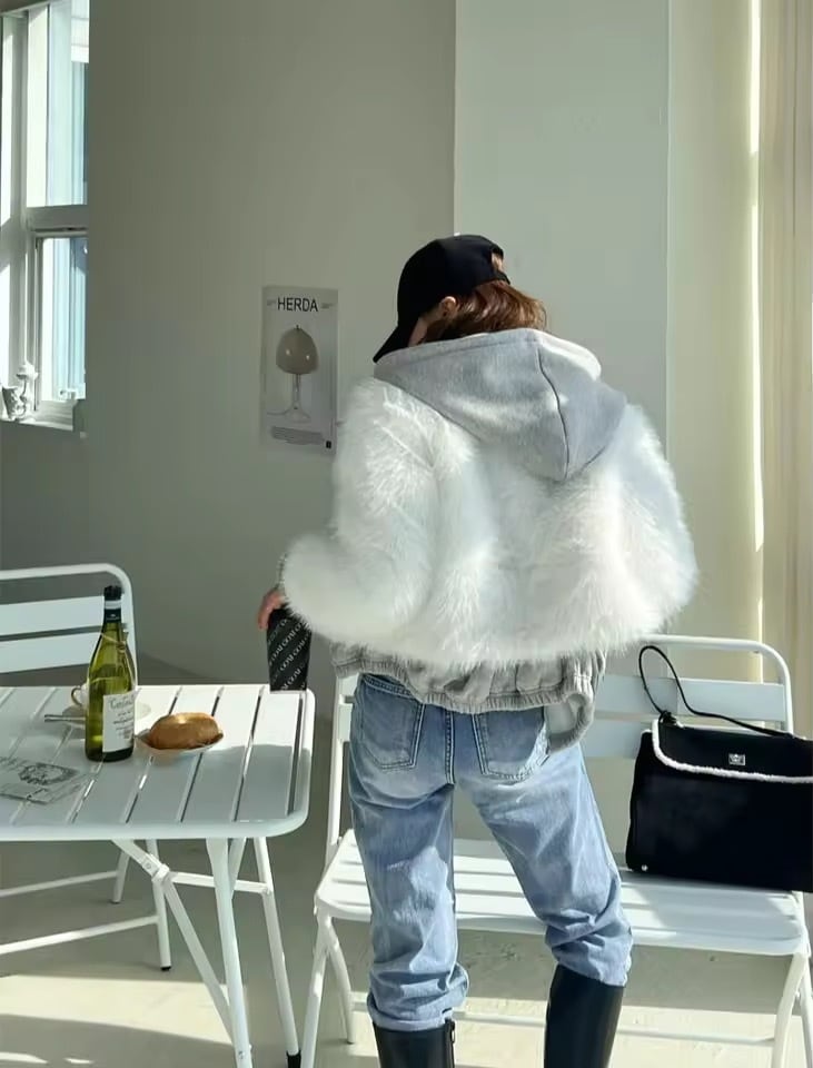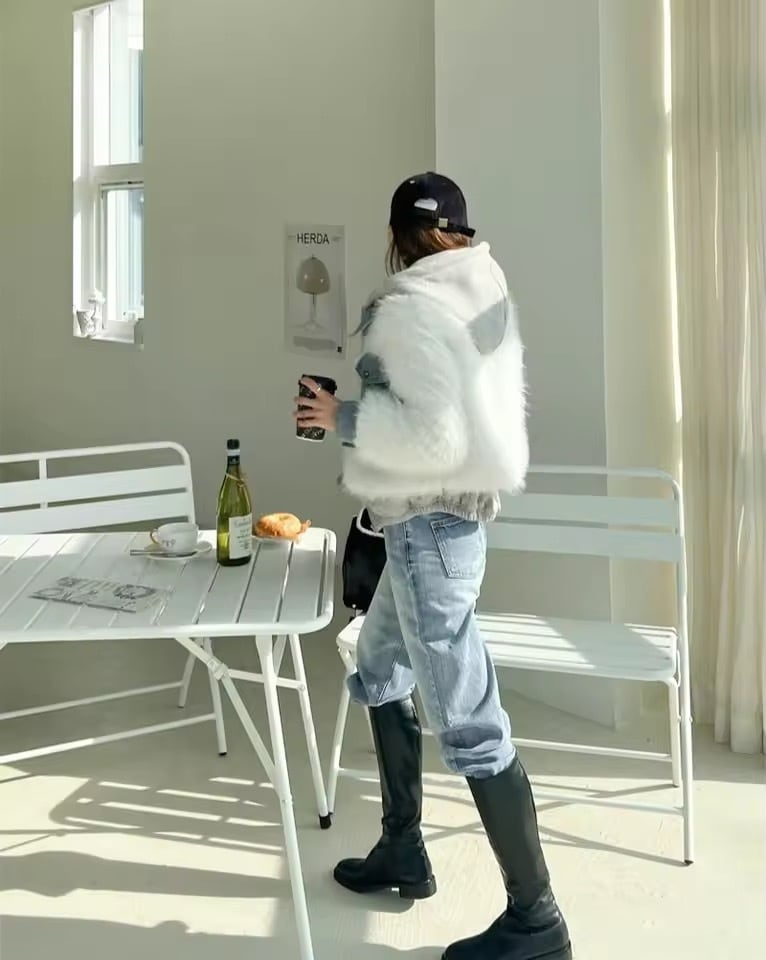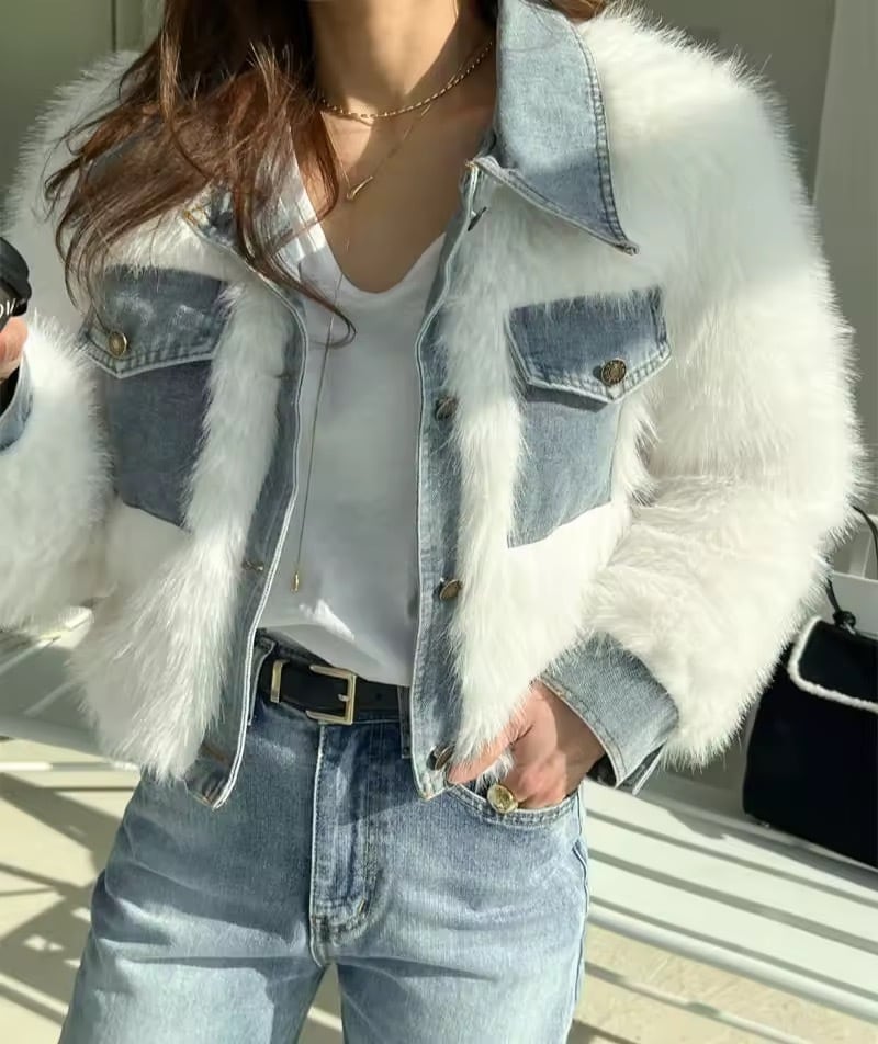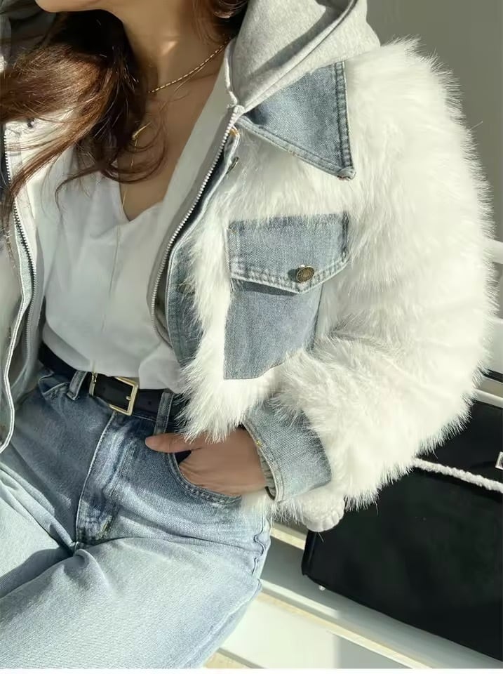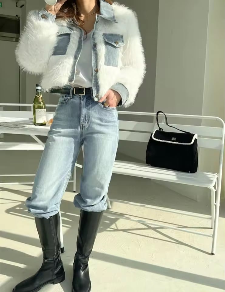 デニムドッキングデザインのファーアウター。