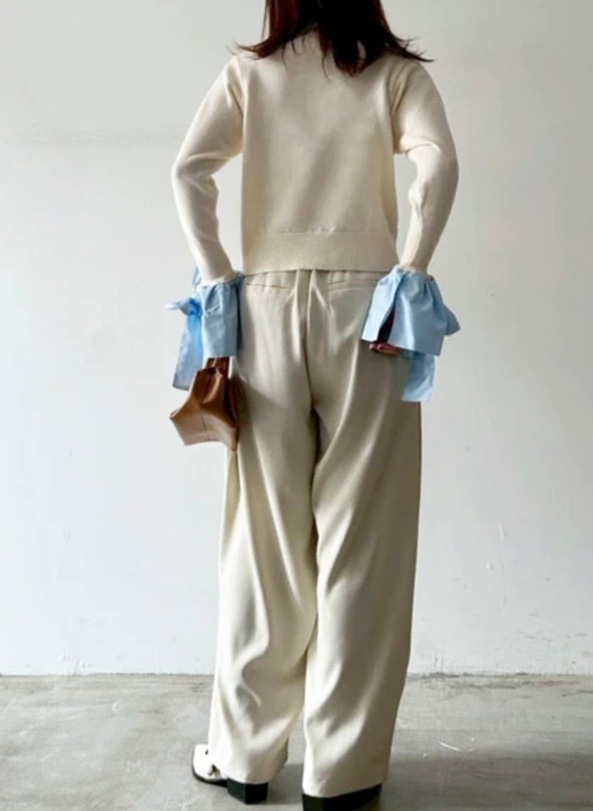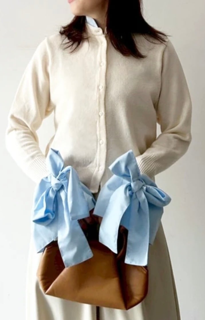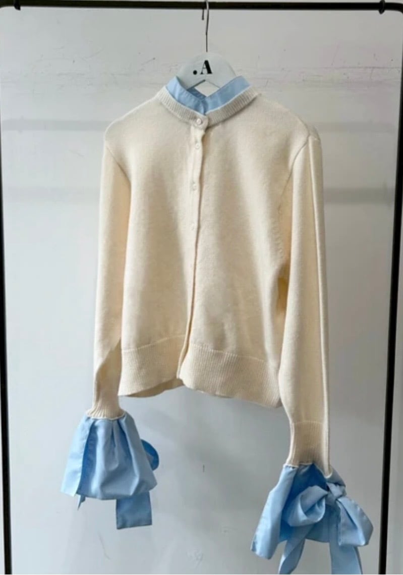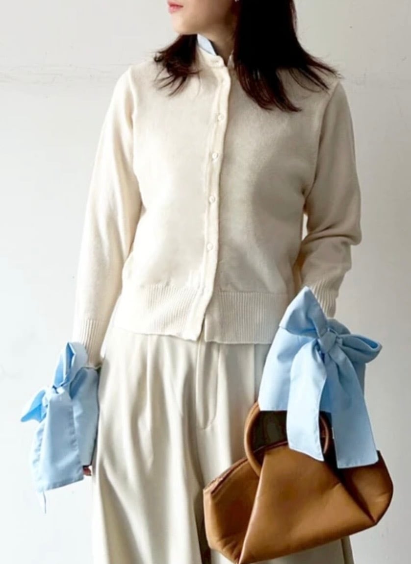 リボンスリーブのブラウスがドッキングになったニットカーディガン。