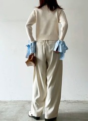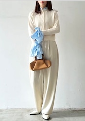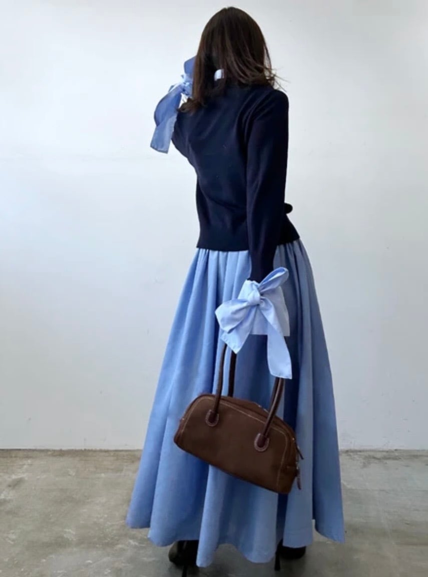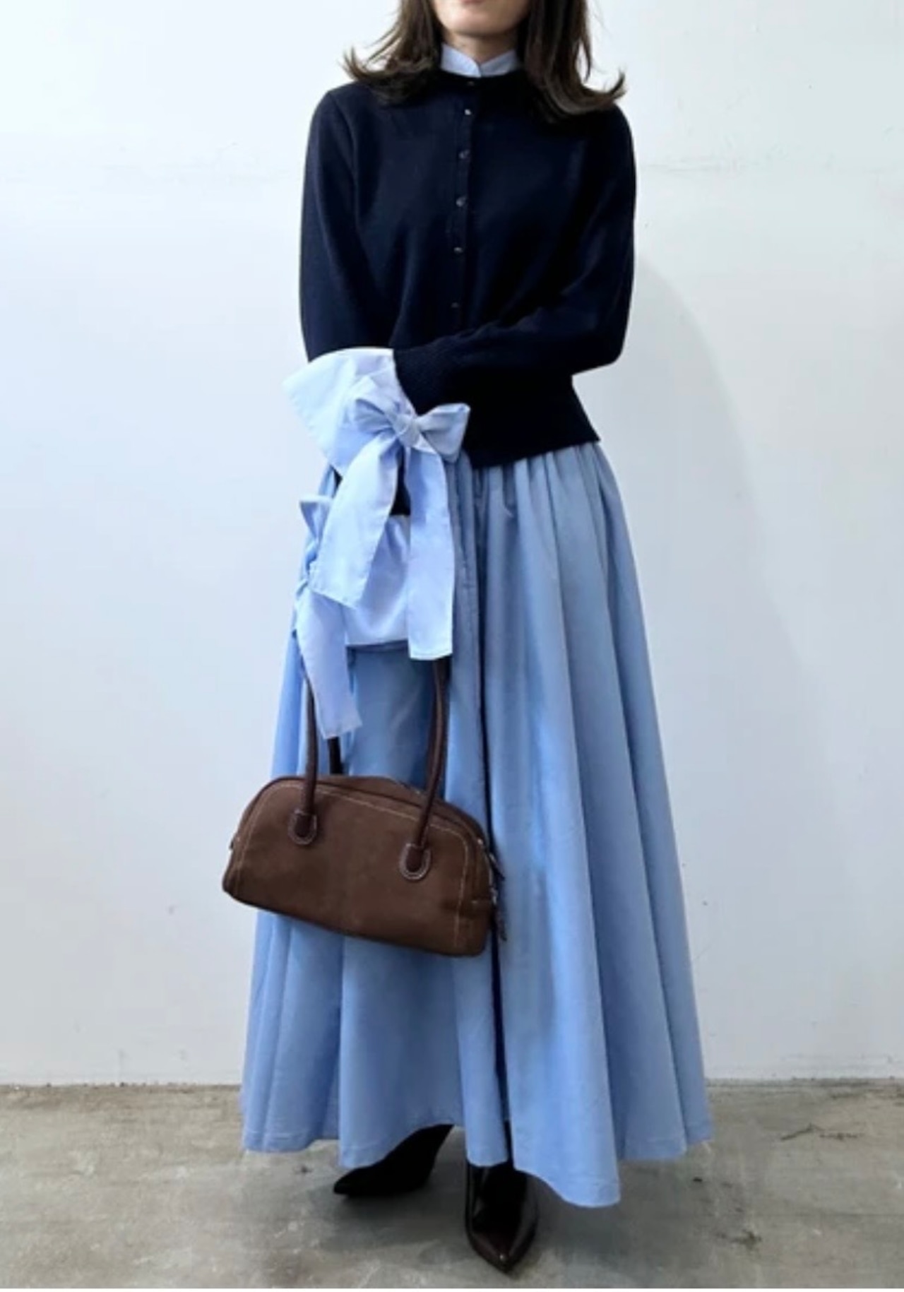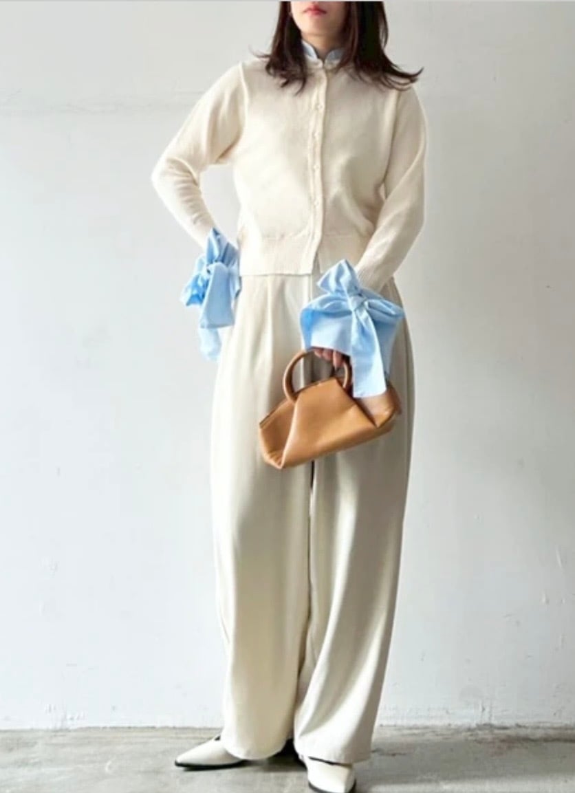 リボンスリーブのブラウスがドッキングになったニットカーディガン。