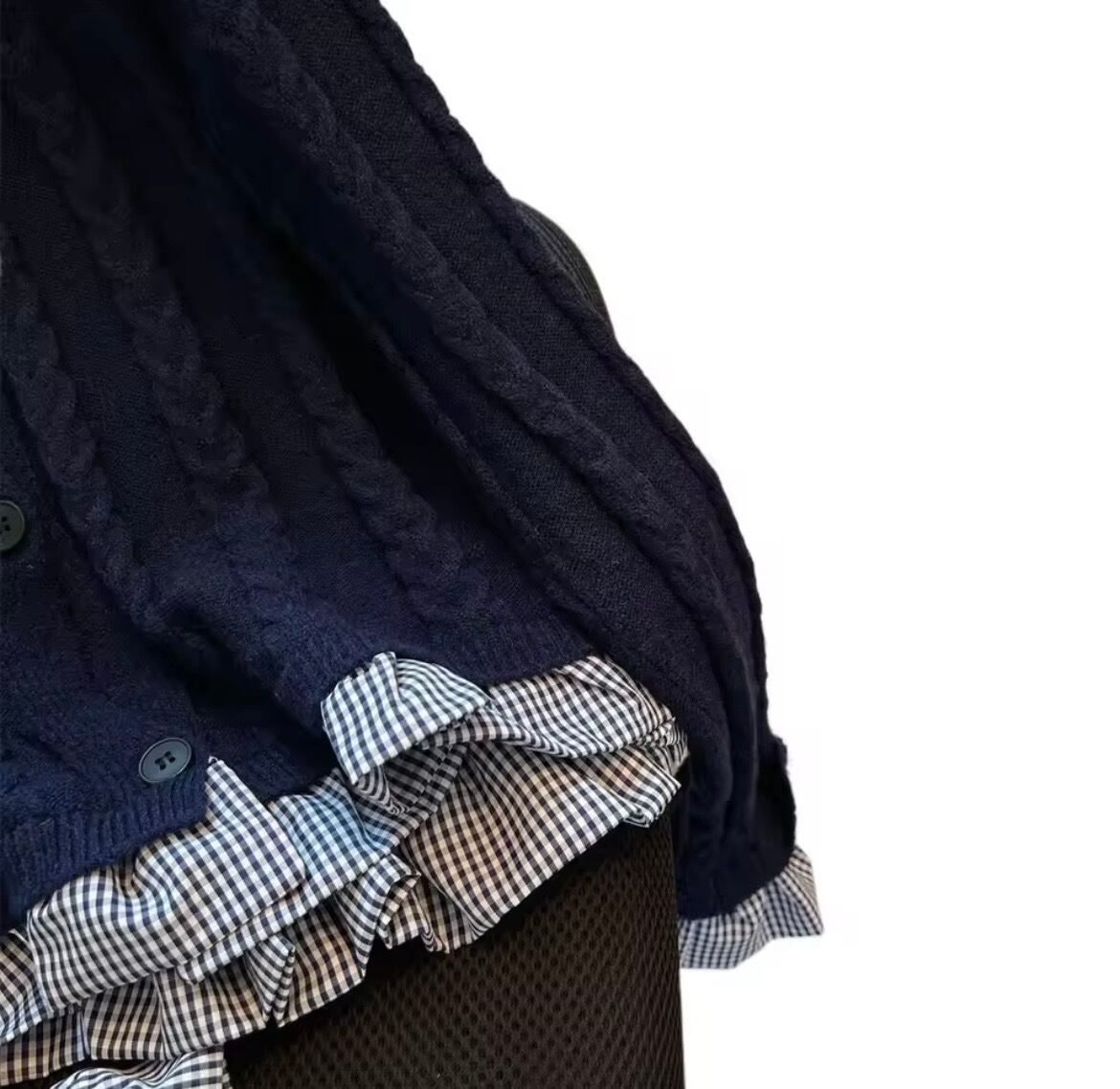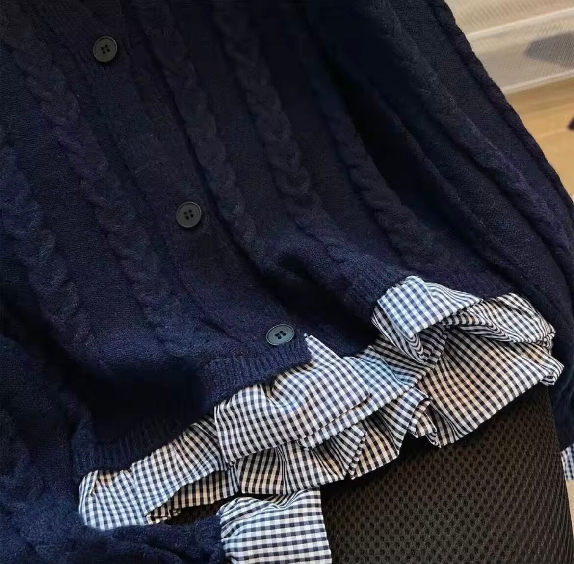 ギンガムチェックのブラウスがドッキングになったニットカーディガン。