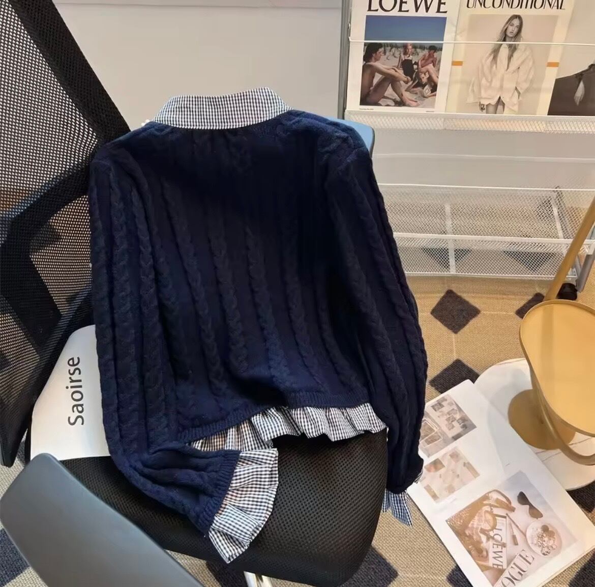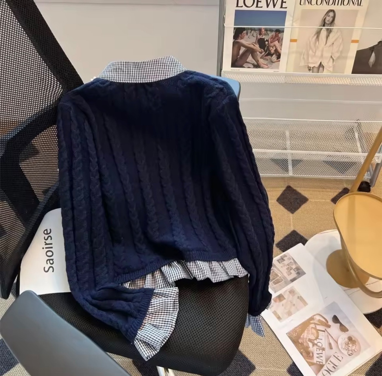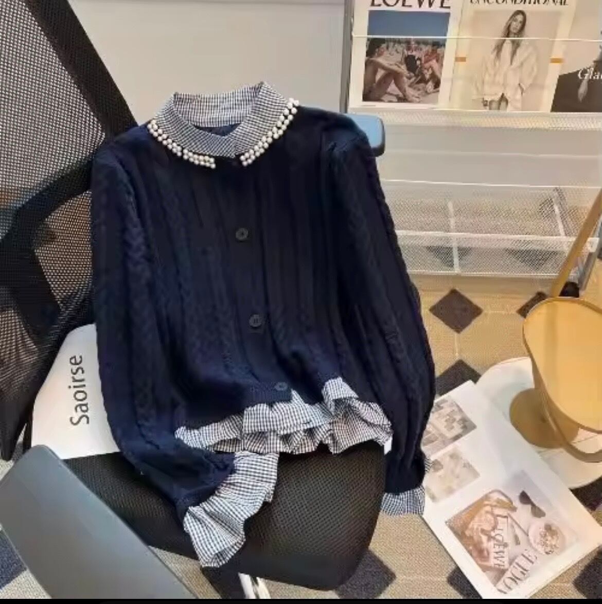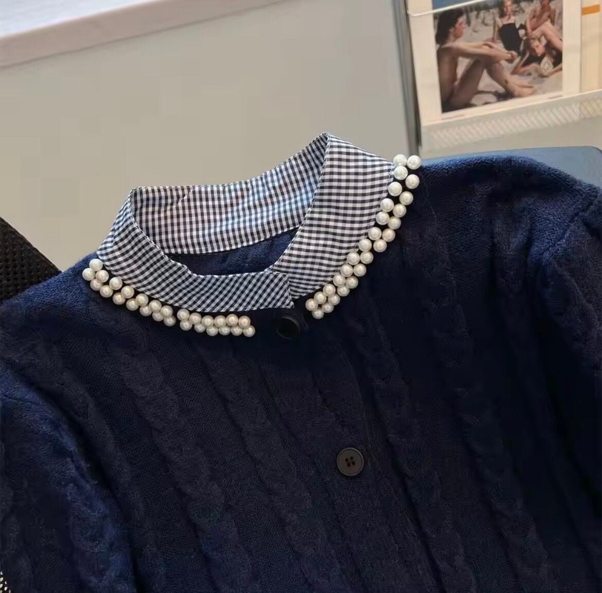 ギンガムチェックブラウスドッキングニットカーディガン(一ヶ月程でお届け)