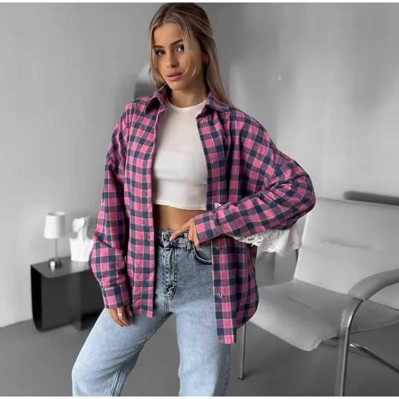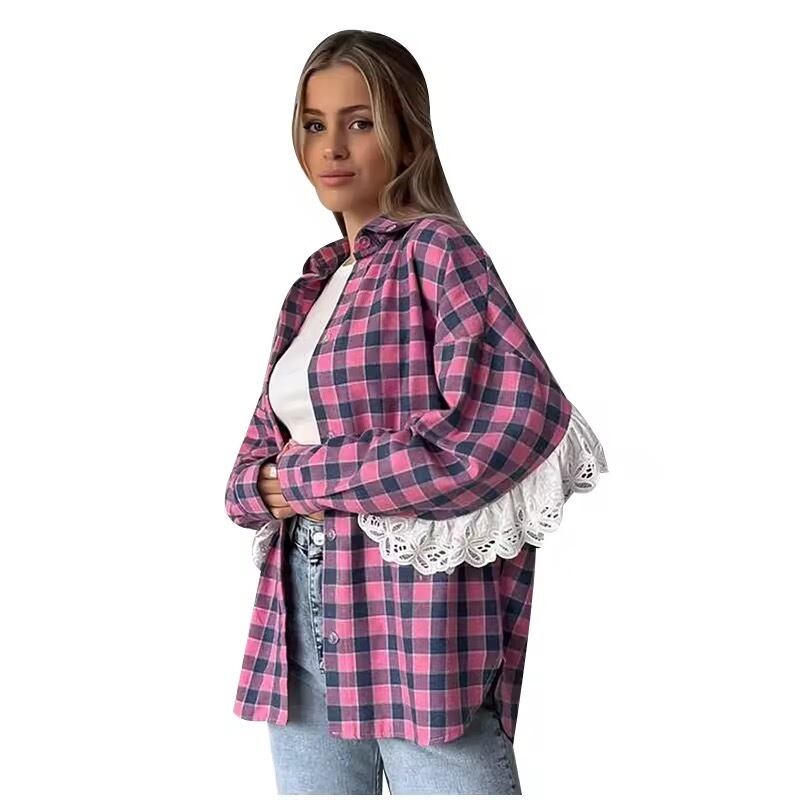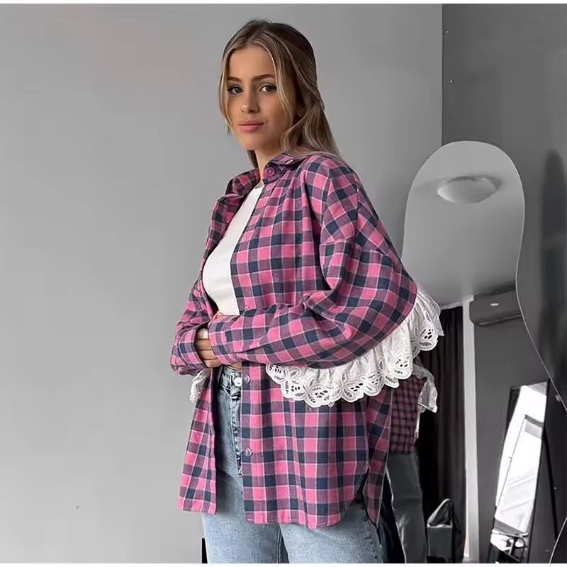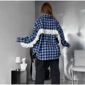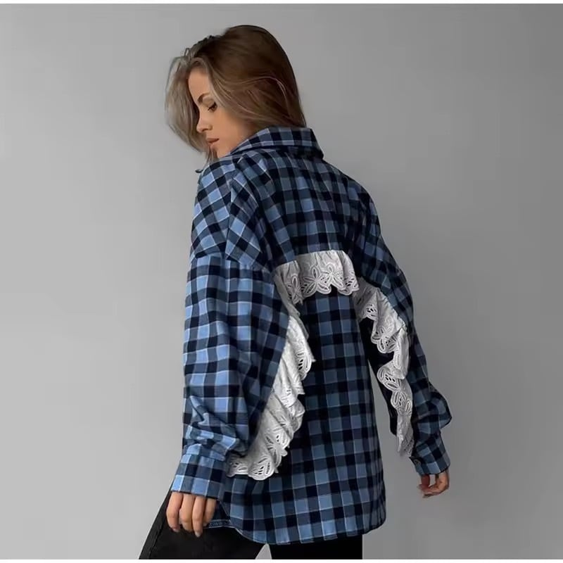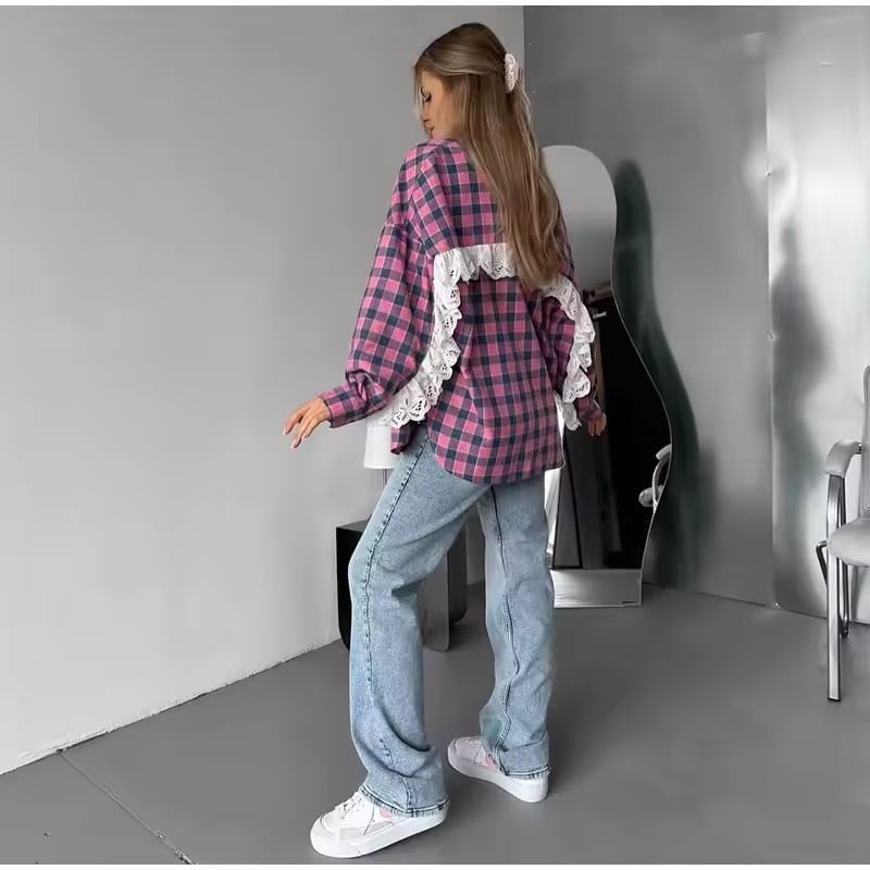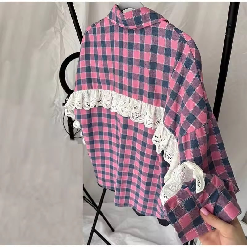 フリルレースが、お袖からバックスタイルにかけてデザインされたチェック柄ブラウス。