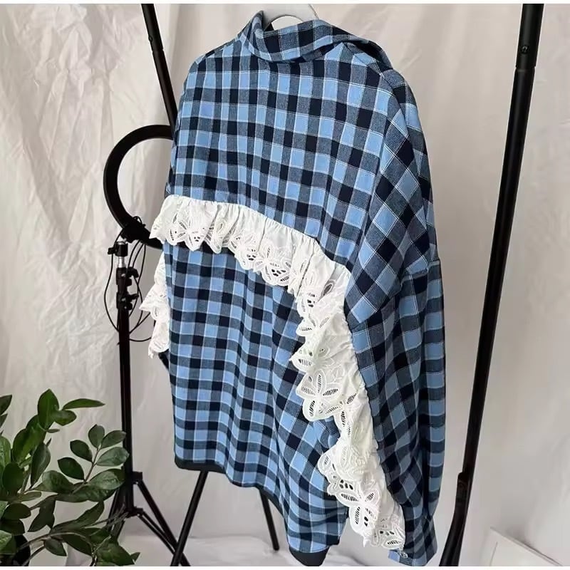 フリルレースチェックブラウス(一ヶ月程でお届け)