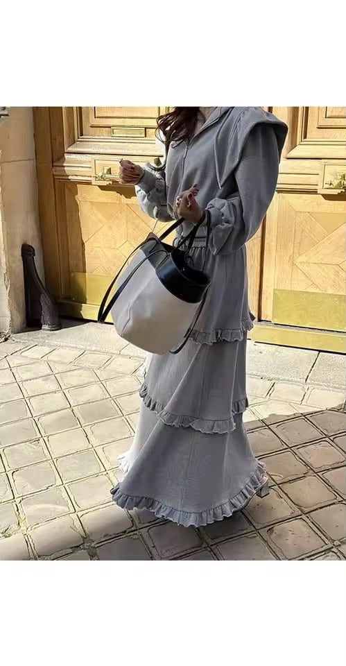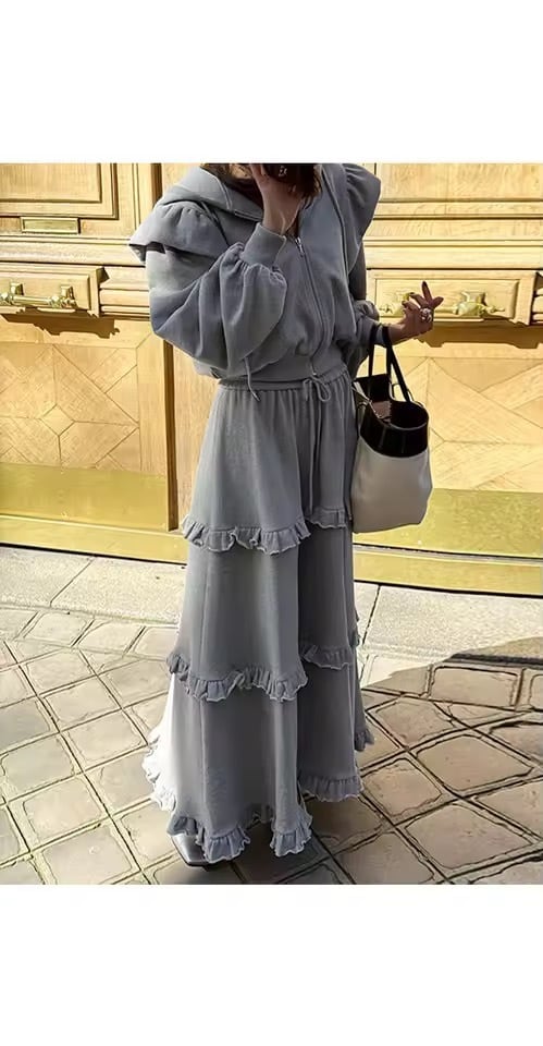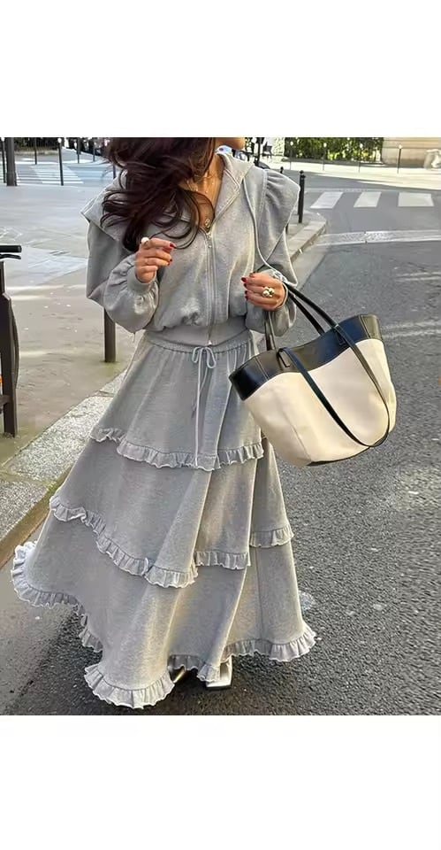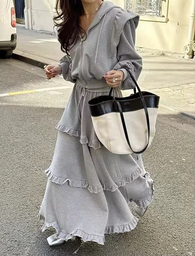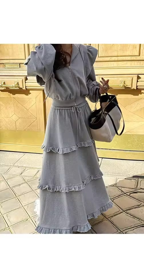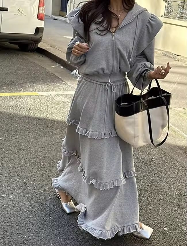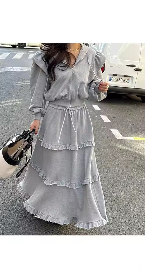 フリルスカートとパーカーのスウェットセットアップ。