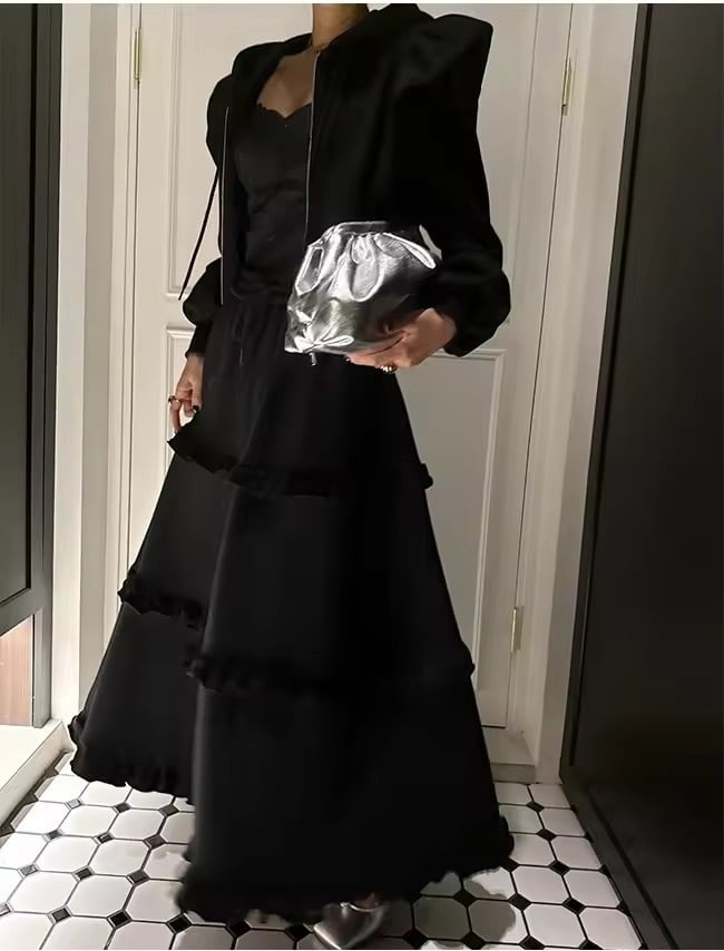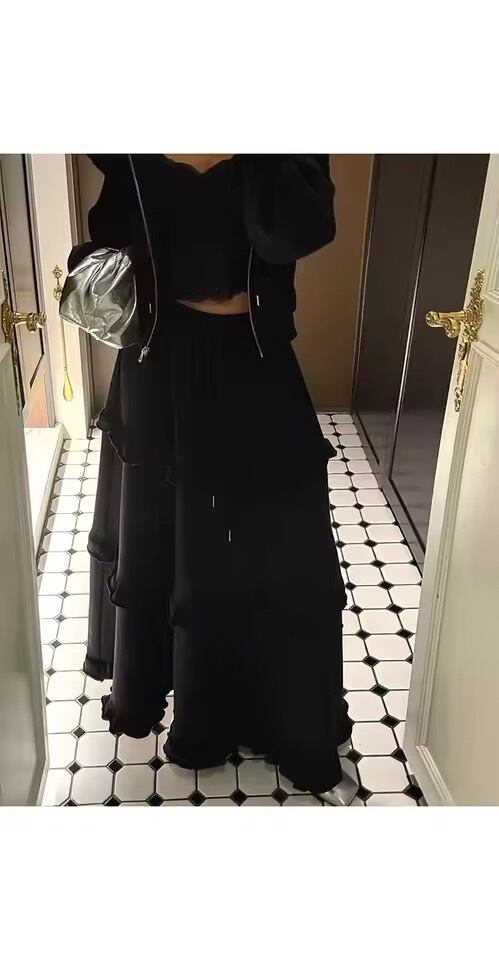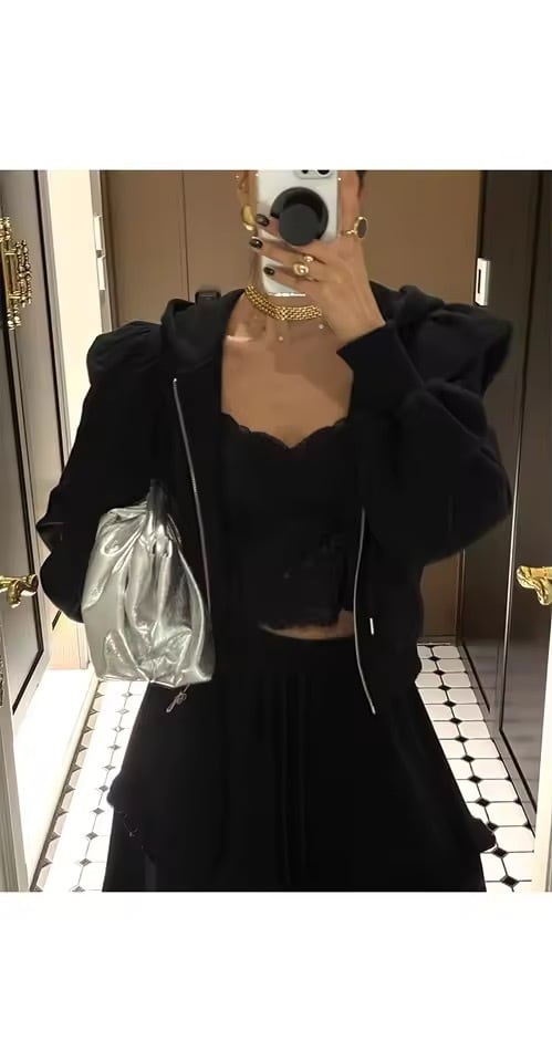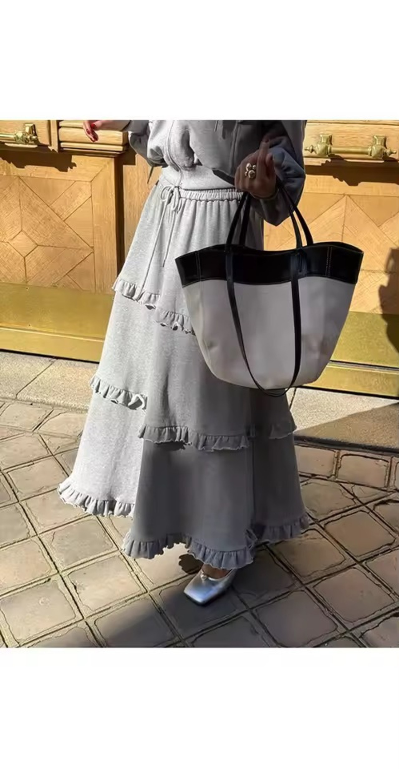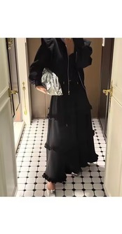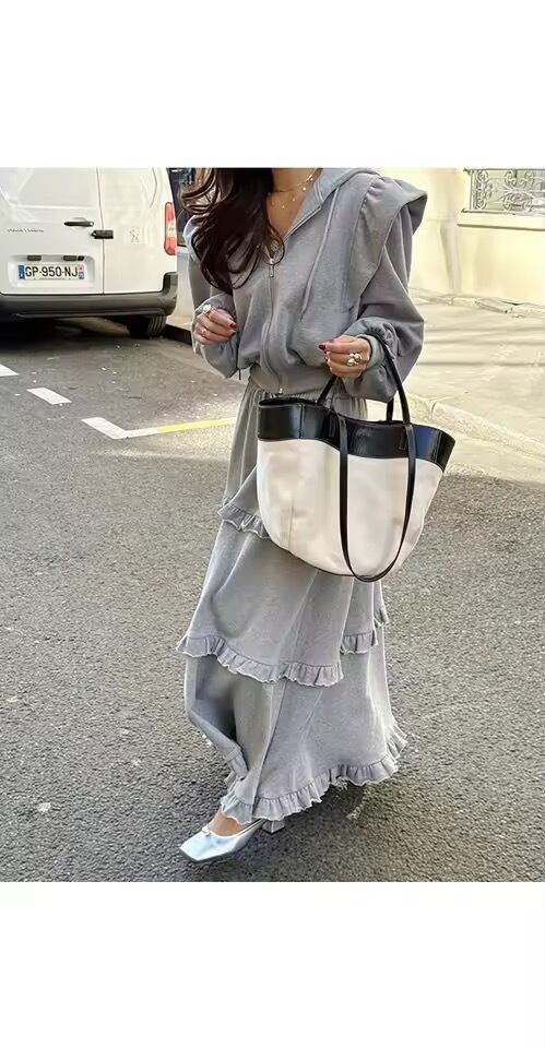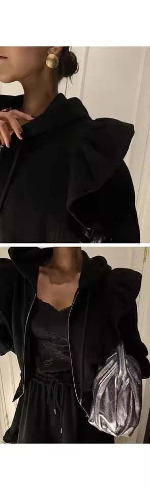 フリルスカートとパーカーのスウェットセットアップ。