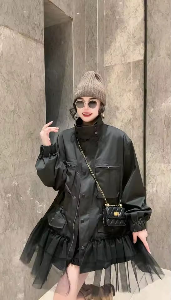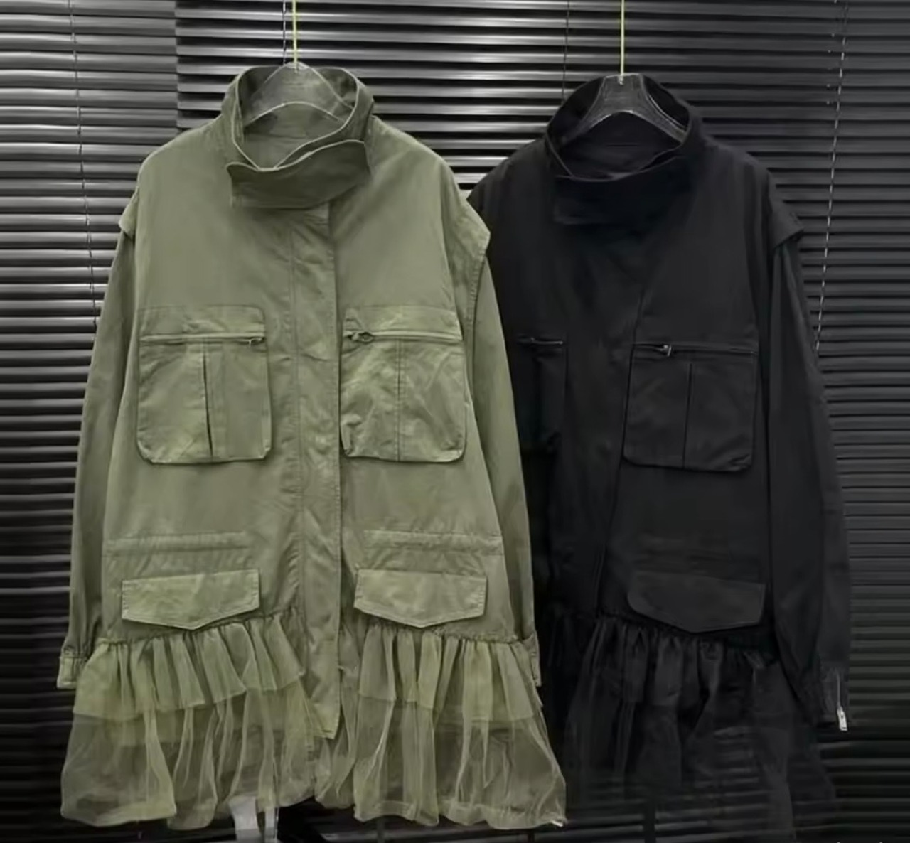 裾チュールがアクセントのミリタリーアウター。